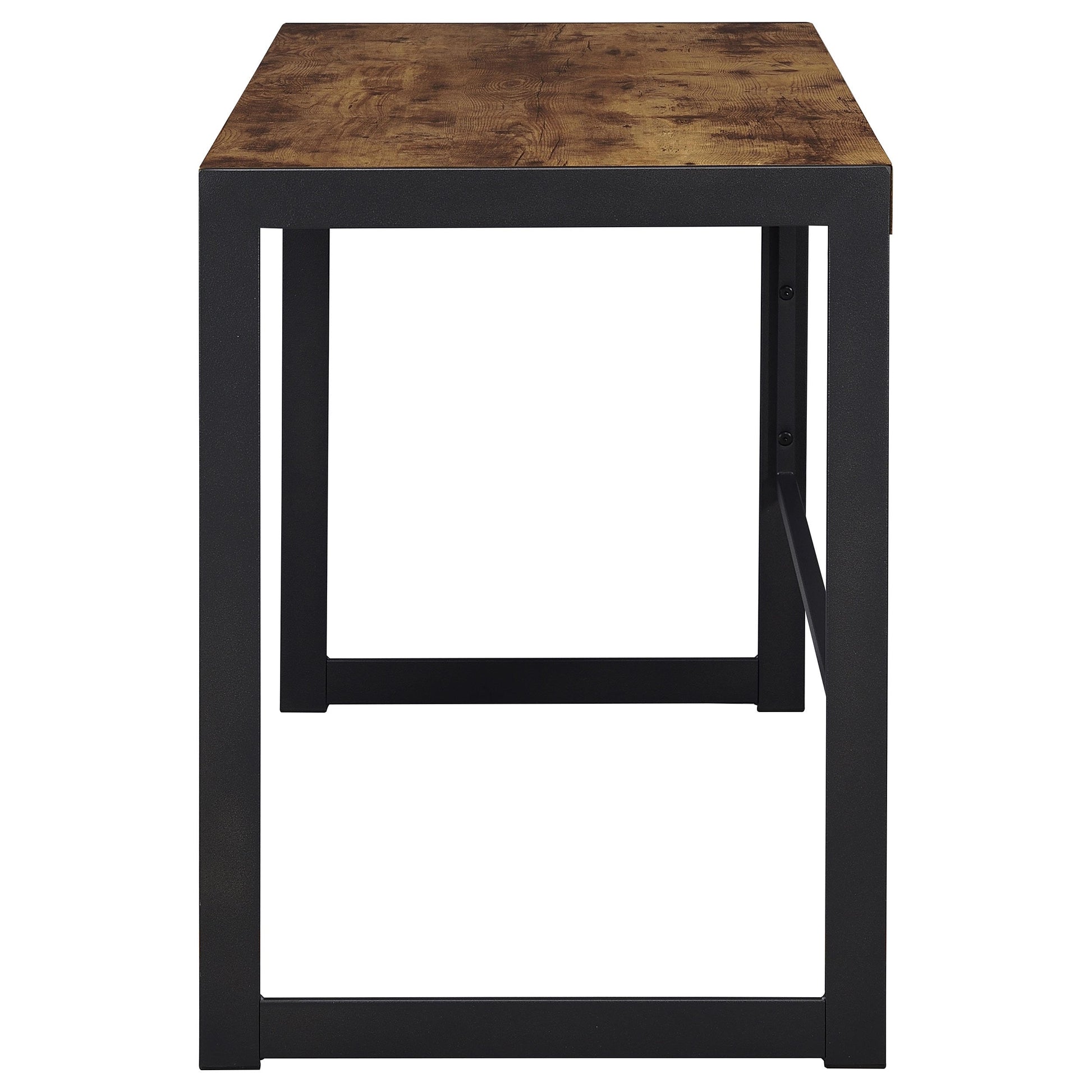Este elegante escritorio combina líneas modernas y elegantes con un toque rústico. Su encantador acabado en nuez moscada antigua contrasta con el estilo contemporáneo de su estructura de bronce. La estructura está elaborada con maestría para lograr un diseño impactante, realzado por ángulos definidos. Su sencilla superficie de madera tiene el tamaño perfecto para portátiles, notebooks y más. Elegante y compacto, este escritorio se adapta perfectamente a espacios pequeños.