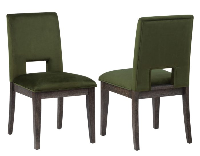 El juego de comedor Evan, con una mesa de 198-243 cm, presenta un estilo moderno y audaz en una configuración práctica. La pieza central es una impresionante mesa con base de doble pedestal, líneas limpias y un sistema de deslizamiento ultrasuave que se extiende y guarda fácilmente cuando no se usa. El acabado en nogal cepillado con un cierre encerado aporta sofisticación, y combina a la perfección con las lujosas sillas auxiliares de terciopelo verde para mayor comodidad. Aporta un toque informal inesperado a este impresionante conjunto, perfecto para recibir invitados y para cenas diarias.