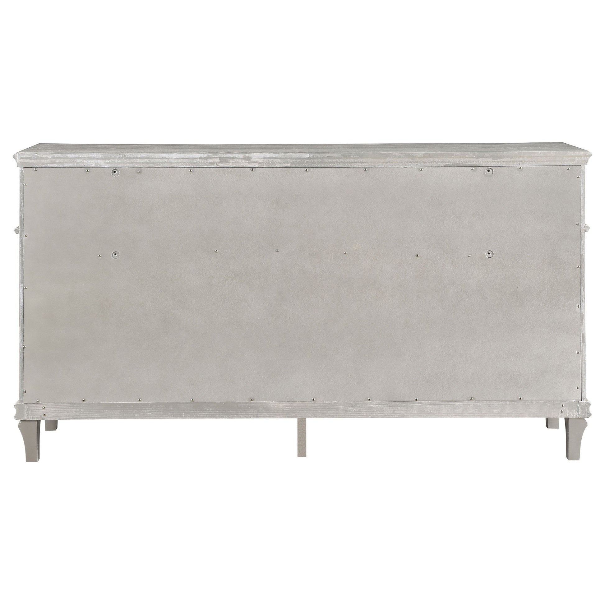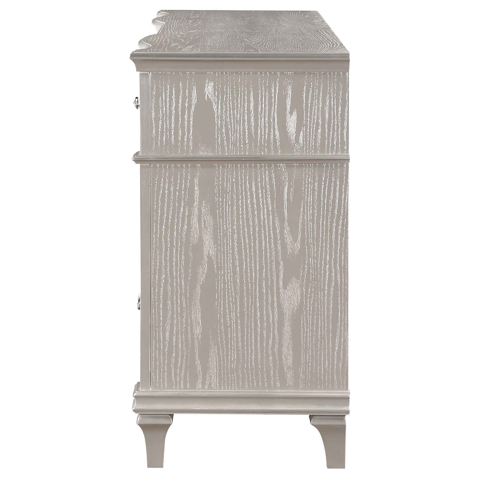 Un acabado en roble plateado le da un toque elegante a esta glamurosa cómoda de nueve cajones. Pomos hexagonales y tiradores con asa abatible con detalles perlados adornan cada uno de los nueve espaciosos cajones, dándoles un aspecto lujoso. Mantén tus objetos esenciales organizados en los cajones superiores forrados en fieltro gris y tu ropa en los profundos cajones inferiores. El frente de la cómoda presenta una fachada curva que recorre los frentes de los cajones y termina en dos brillantes paneles de columnas. Las encantadoras molduras de madera en la parte superior e inferior, junto con una intrincada moldura, le otorgan un toque clásico.