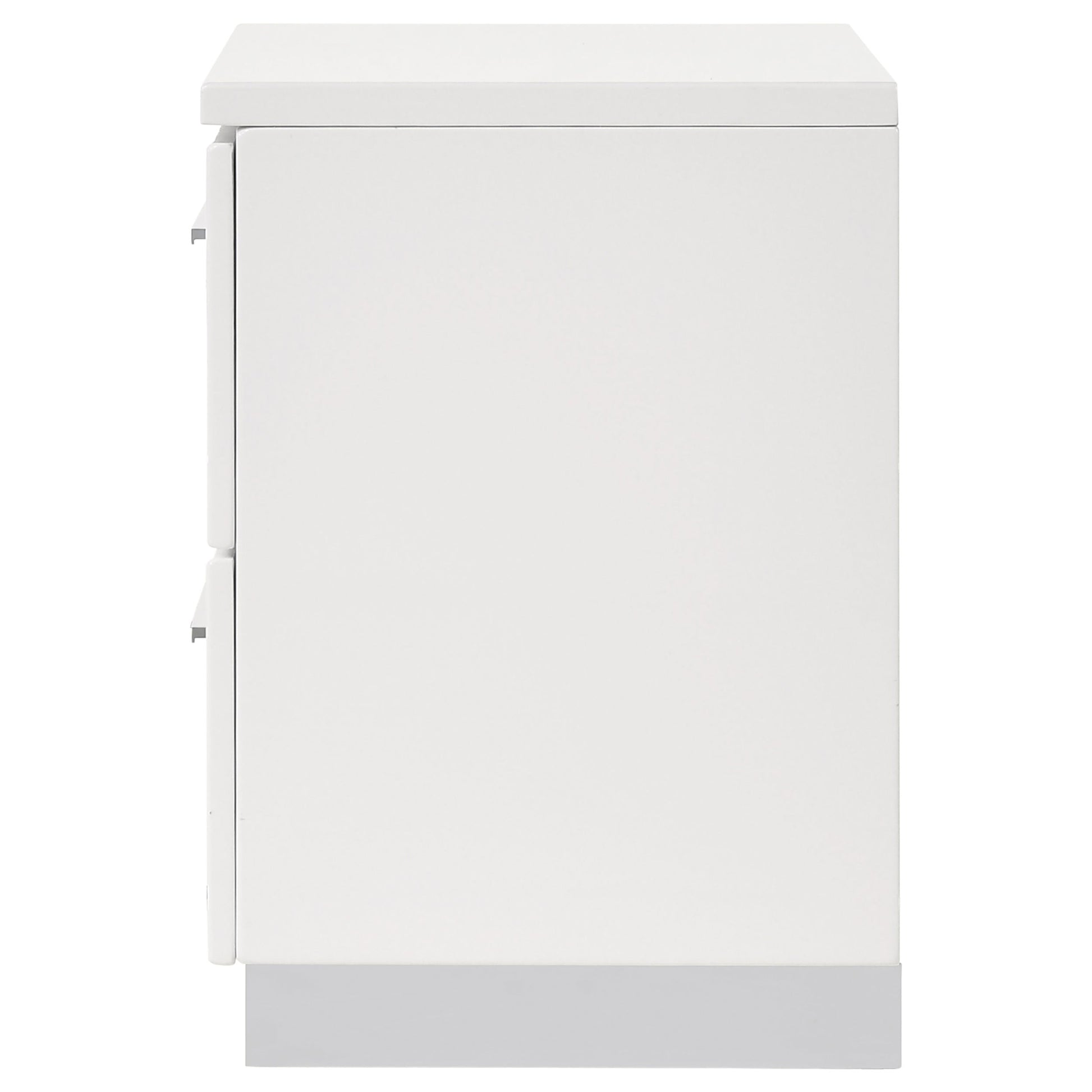 Dale un toque funcional a tu dormitorio con esta moderna mesita de noche de dos cajones. Con un acabado blanco brillante, ofrece una apariencia limpia y pulida que complementa los interiores contemporáneos. Los tiradores y patas de metal cromado le dan un toque refinado, mientras que las guías extensibles metálicas garantizan un manejo suave de los cajones. Diseñada para el uso diario, esta compacta unidad de almacenamiento combina durabilidad con una estética elegante.