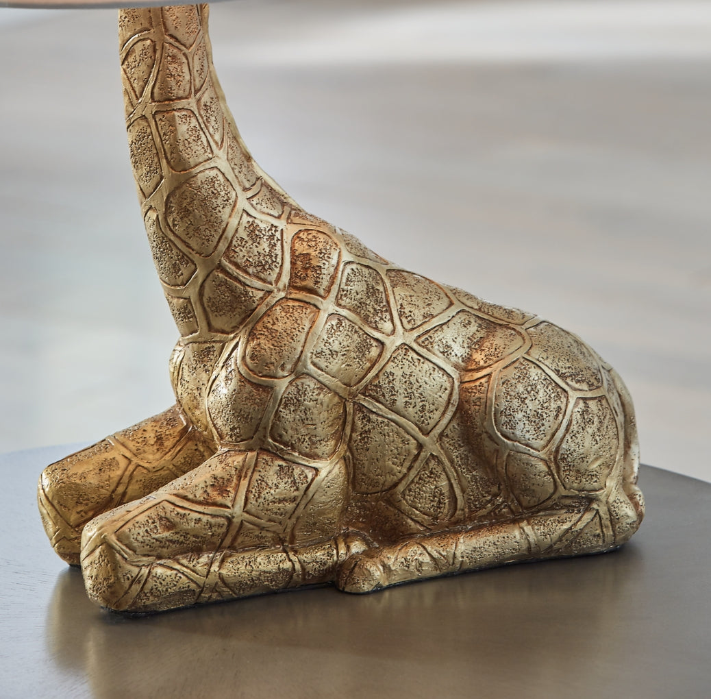 This giraffe lamp combines contemporary style with eclectic charm. The curious animal peeks out over the top of the shade, adding a playful touch to the safari-inspired vibe. For glam appeal, a goldtone finish completes the look.