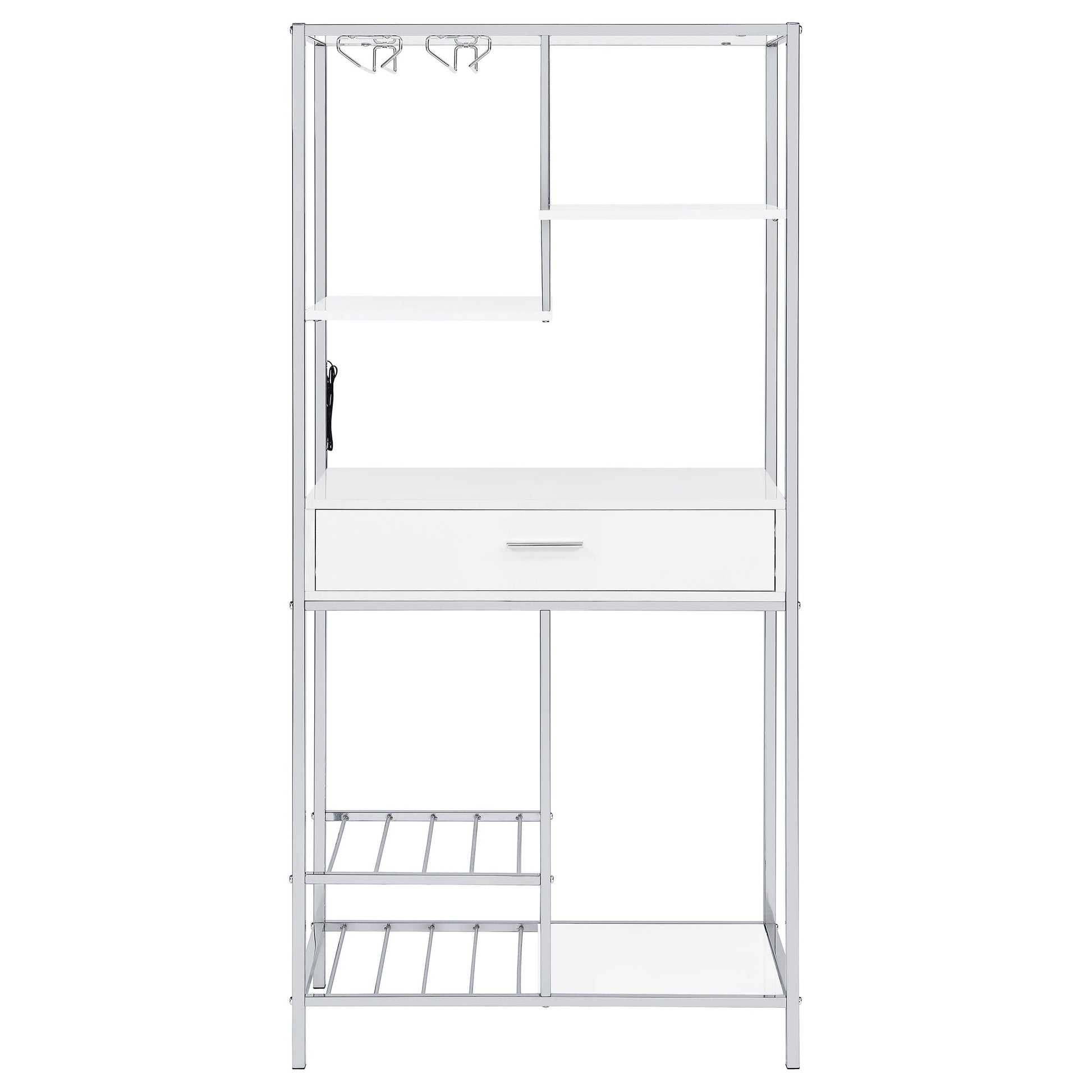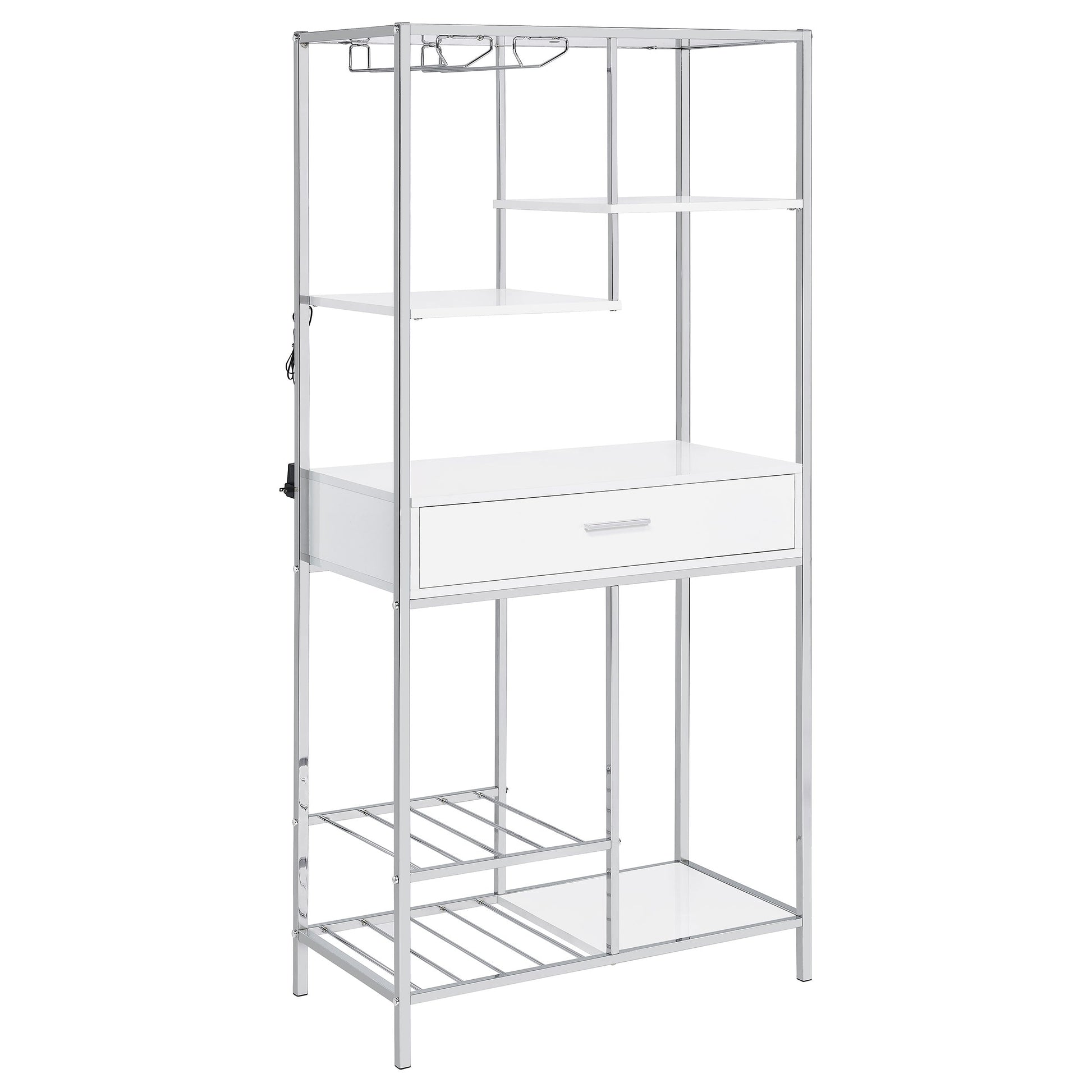Su diseño modular con iluminación LED integrada ofrece una apariencia fresca y moderna, ideal para recibir invitados en un ambiente contemporáneo. Esta vinoteca presenta un diseño minimalista y lineal con cuatro estantes abiertos, un práctico cajón extraíble, dos niveles para botellas de vino y soportes integrados para copas. Fabricada en madera de ingeniería con un acabado blanco brillante resistente a los arañazos, se complementa con una elegante estructura rectangular con acabado plateado. Combinando estilo y funcionalidad, es la opción ideal para servir y recibir invitados.