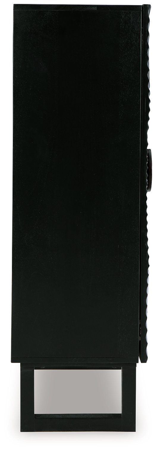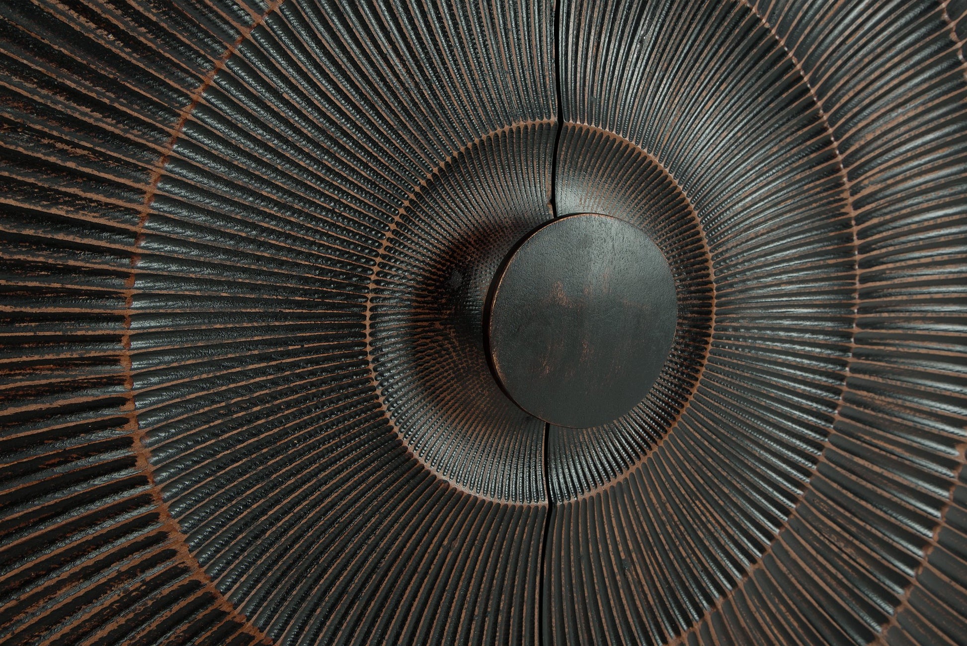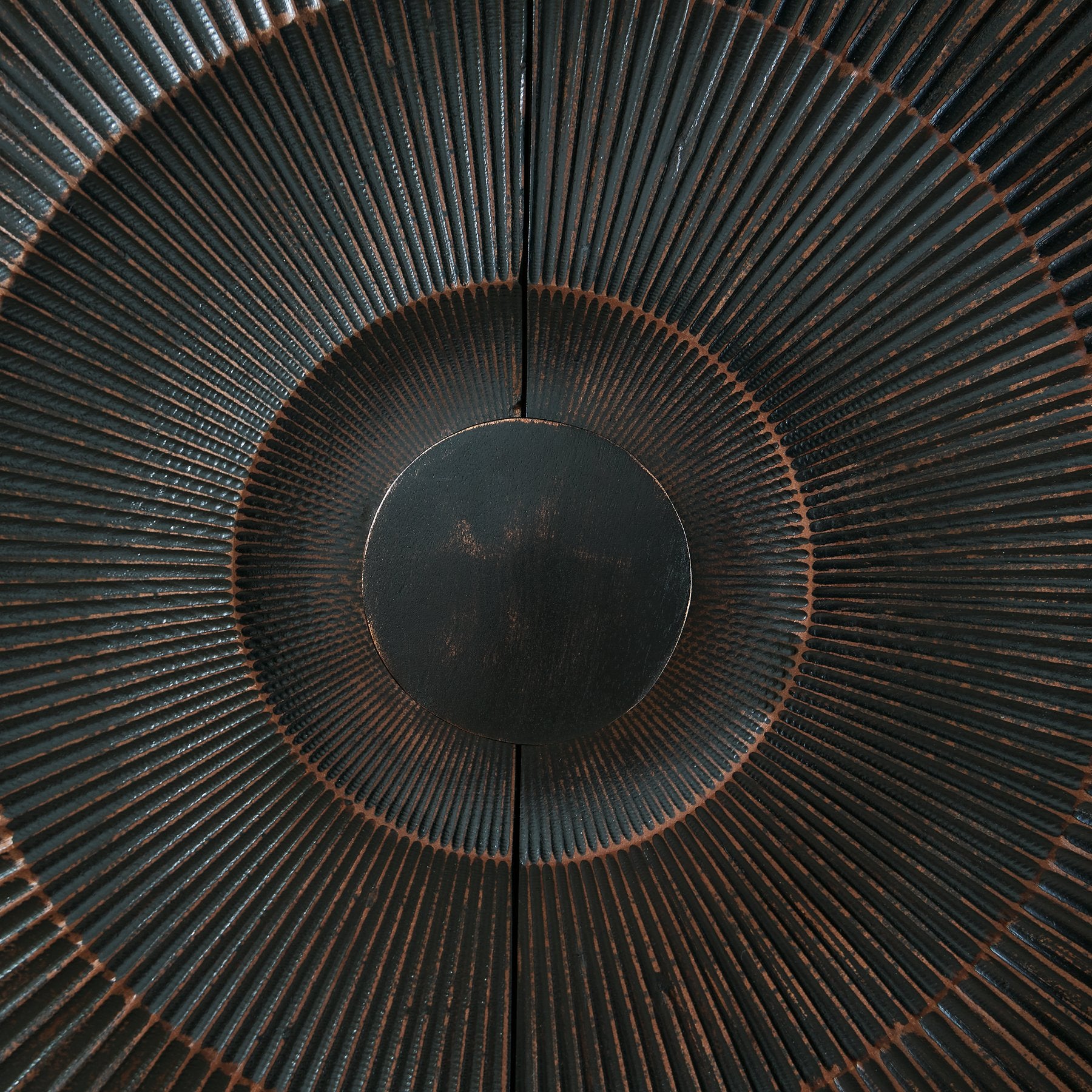 El estilo sofisticado está en auge con este armario con detalles de madera. Sus impresionantes puertas, adornadas con un diseño tallado de rayos de sol y un tirador de madera de gran tamaño, se abren para revelar dos estantes. Su acabado negro envejecido le aporta un toque contemporáneo. Ya sea para guardar cosas o para ocultar el desorden, este armario es una auténtica joya.| Dimensión completa | 40 ancho x 15 profundidad x 48 alto |