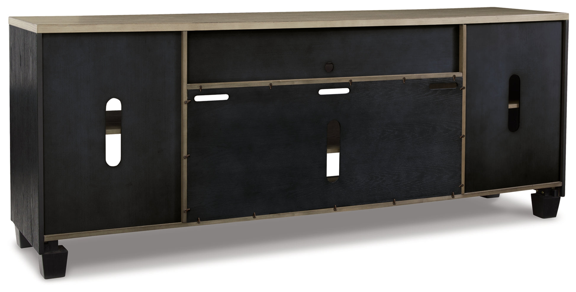 This TV stand with fireplace option is rustic, casual contemporary style simply done right. Its two-tone color scheme features a rich brushed black finish accented with a dusty grayish brown wood tone. With two glass-front cabinets (each with an adjustable shelf), an open cubby and a removable center shelf, it offers plenty of storage to house all of your electronic needs. Compatible with W100-12 electric LED fireplace insert (sold separately).