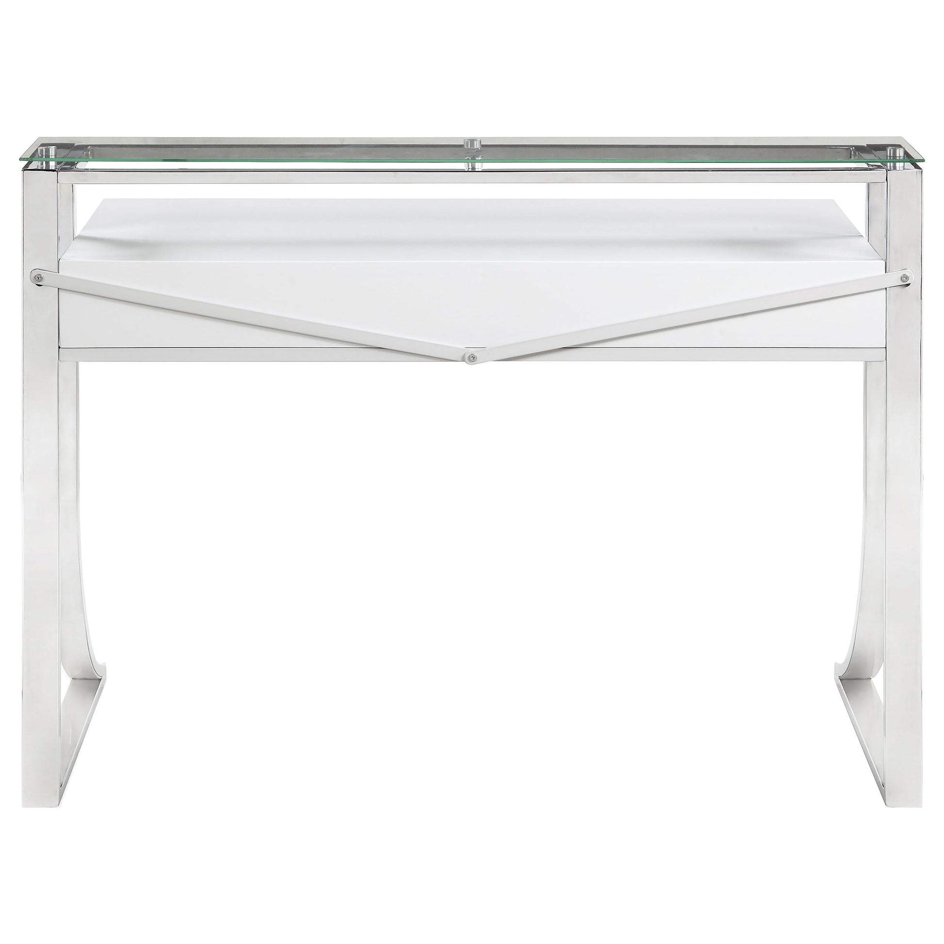 Dale un toque contemporáneo a cualquier espacio. Este elegante y estiloso escritorio irradia glamour. Su llamativa estructura está elaborada con maestría y presenta una silueta elegantemente curvada. Su hermosa superficie blanca brillante combina a la perfección con sus relucientes patas cromadas. Completo con dos cajones forrados en fieltro con guías de extensión completa, este escritorio realza cualquier oficina en casa con comodidad y estilo moderno.