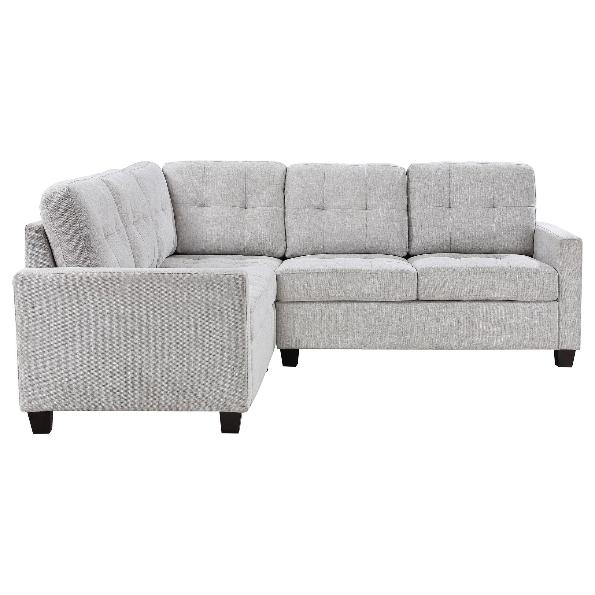 Recibir invitados es pan comido con un estilo de transición, ya que este conjunto seccional ensambla piezas formando un sofá en forma de L, ideal para salas de estar y salas de entretenimiento. Los elementos de diseño clásico son agradables, como la estructura de madera que forma una base cuadrada recta y brazos delgados. La hermosa tapicería de tela ofrece opciones para combinar con la paleta de colores de la habitación. Siéntese con relativa comodidad en los cojines de asiento con relleno de espuma y en los cojines de respaldo reversibles, todos con un sutil capitoné. Las robustas patas de madera aportan un toque divertido e icónico a un conjunto que incluye una silla esquinera, un loveseat a la izquierda y un loveseat a la derecha.