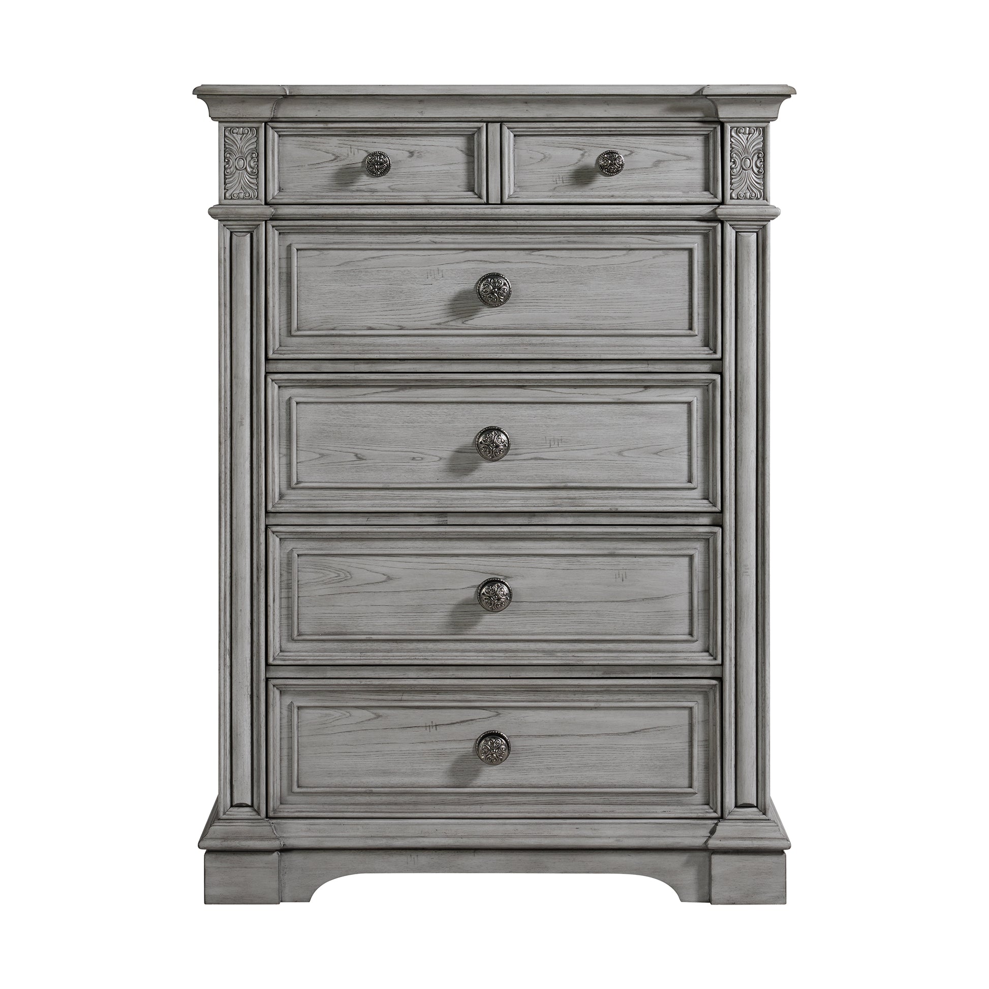 The Glenmore Chest offers the perfect blend of classic charm and modern functionality. Its five-drawer design provides ample storage, while the rich wood grain wire brushed finish adds a touch of rustic elegance. Crown molding and framed drawer panels enhance the traditional aesthetic, complemented by decorative knobs with intricate detailing. The raised pedestal feet ensure stability and style, making it a versatile addition to both traditional and transitional bedroom settings. The cedar-lined bottom drawers keep your belongings fresh. Elevate your bedroom with the timeless beauty of the Glenmore Chest.