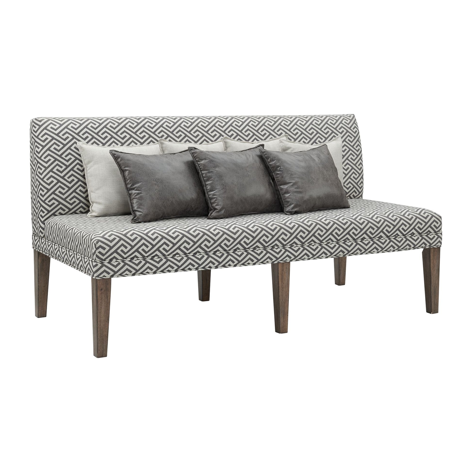 The 6PC Dining Set will look fantastic in your home! This set includes a table, four tall back side chairs and a settee. This table is perfect for entertaining several people thanks to not one, but two removable, extension leaves. With both leaves in, the table can easily go from 84" wide to 108" wide; giving you more than enough elbow room. This standard height table has a double pedestal base, instantly adding extra flair to this already stylish set. These chairs feature a faux leather upholstered seat and back in a rich, chocolate color. The faux leather is distressed, instantly adding character and charm to this chair duo. Slate, nail head trim outlines the back and seat of the chairs, instantly adding extra flair to this already stylish set. This settee adds a pop to your dining room thanks to its transitional print. This settee includes seven pillows total, instantly dressing up your dining room.