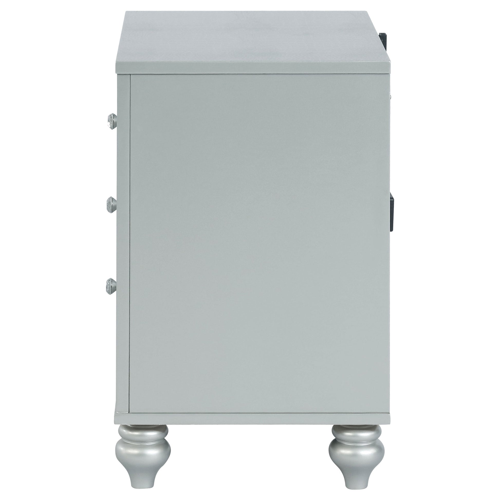 Dale un toque de glamour moderno a un diseño clásico con esta mesita de noche de dos cajones de estilo transicional. Su diseño deslumbrante es el centro de atención en cualquier hogar moderno. Presenta un vibrante acabado metálico plateado con detalles calados en los paneles frontales y los frentes de los cajones. Los cajones están adornados con tiradores de imitación cristal y el superior está forrado con fieltro negro. Dos puertos USB y delicadas patas de moño completan el diseño de esta exquisita pieza decorativa.