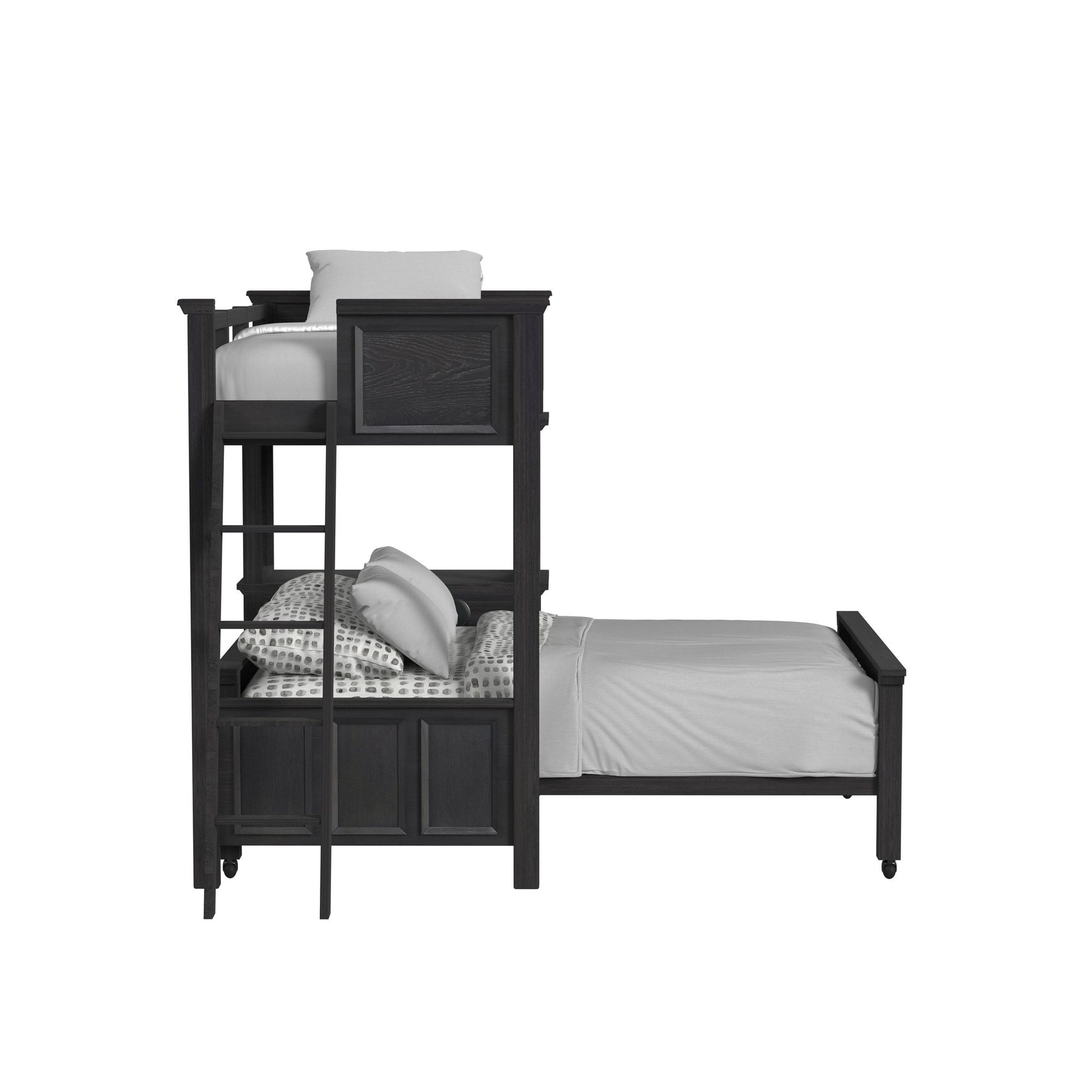 Maximize your childÕs bedroom space with the Hampton Kids Twin Over Full Loft with Ladder and Desk with Speakers. Designed with stability in mind, this piece is built of solid and engineered wood with a grained oak veneer, creating the illusion of depth. The desk is conveniently equipped with speakers and drawers, while the bottom bedÕs legs are fashioned with casters to protect flooring and simplify movement. Top-bunk guardrails enhance safety, while support slats forming clean lines reinforce the bedÕs structure. For comfort, durability, and style, the Hampton Kids Twin Over Full Loft with Ladder and Desk with Speakers delivers.