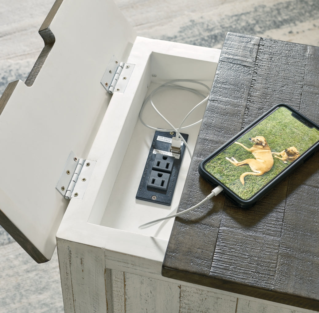 What a fresh interpretation of country classic style. Inspired by American farmhouse craftsmanship, but with an elevated sensibility, this chairside end table blends distinctive details such as turned post accents and raised door fronts for a substantial look that feels right at home. Those who appreciate rustic character should take note of the tableÕs thick crown moulding, beautified with a vintage two-tone finish. A small flip lid located on the top conceals a power outlet and USB ports to keep electronics charged up and close at hand