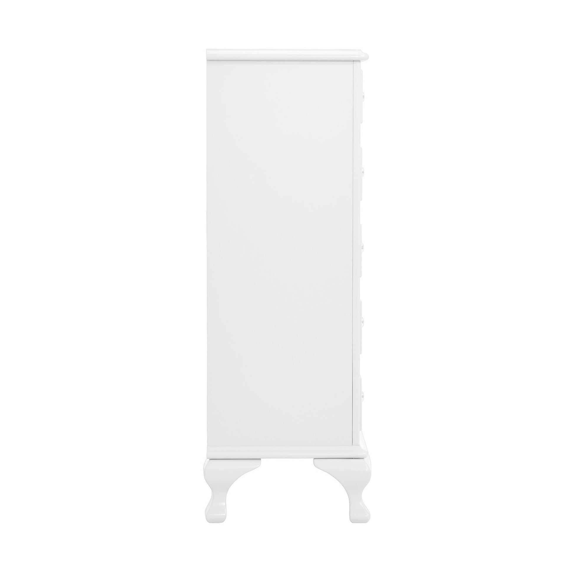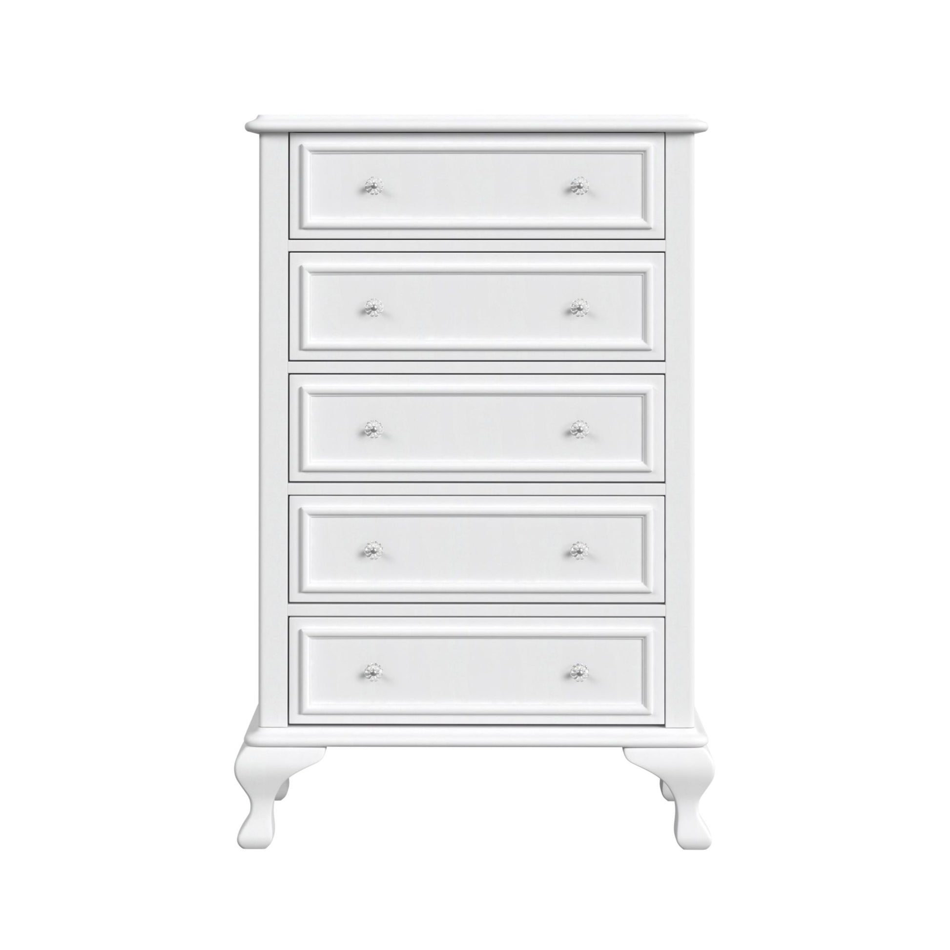 The Jesse 5-Drawer Chest is the perfect addition to your little ones bedroom! This vertical chest comes with five, spacious drawers; perfect for neatly storing away all of your belongings. Raised panel drawer fronts are accompanied by crystal-like drawer knobs, adding an extra element of style to this already stylish set. The classic white finish is easy to match with any existing decor. Bevel edges and arched cabriole feet complete the look of this transitional design.