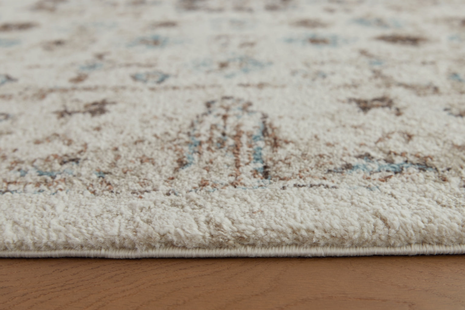 An on-trend take on traditional stylings, this rug brings a pop of pattern underfoot. Simply soothing shades of ivory, brown and teal complement so many settings and color schemes. ItÕs an inviting addition to your home accents.