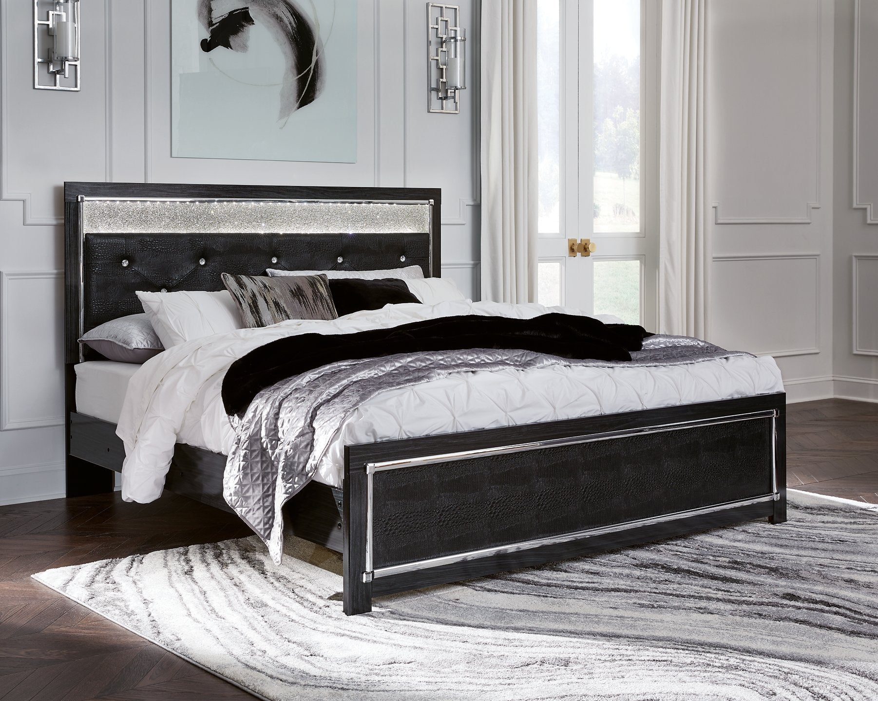 Descanse tranquilo. El lujoso look que siempre ha soñado está a su alcance, a un precio que le encantará. Esta cama con paneles evoca el clásico Hollywood con un toque contemporáneo. Su acabado oscuro y profundo, detalles en cromo facetado e iluminación LED exudan un estilo chic hollywoodense al máximo. Las costuras acolchadas de los paneles de la elegante tapicería negra le dan un aspecto suntuoso, sofisticado y a la moda. Un control remoto inalámbrico le permite controlar el color y el brillo según su estado de ánimo.| Dimensión completa | 80 ancho x 86 profundidad x 53 alto |