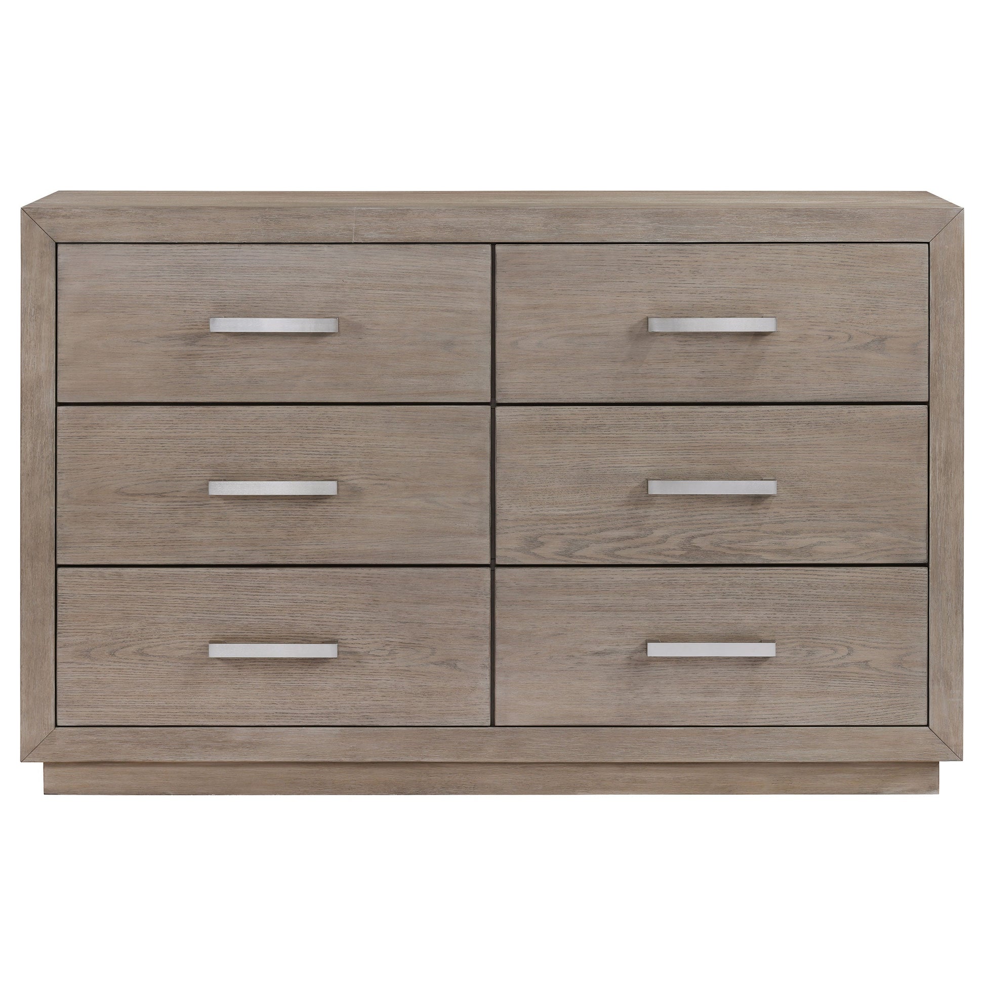 Dale un toque atemporal a la decoración de tu dormitorio con el estilo refinado de esta moderna cómoda de seis cajones. Diseñada con un estilo neutro que se integra con la decoración del entorno, presenta un acabado con vetas de madera color marrón cebada. Los seis frentes de los cajones están adornados con tiradores de barra con acabado cromado para una apariencia cohesiva con un toque de textura y profundidad. La cómoda se complementa con un espejo con marco en la parte superior, que crea un ambiente reflectante en tu dormitorio y un espacio para estilizar tus looks diarios. Añade un joyero o un mueble de noche y un toque decorativo para darle un toque personal.