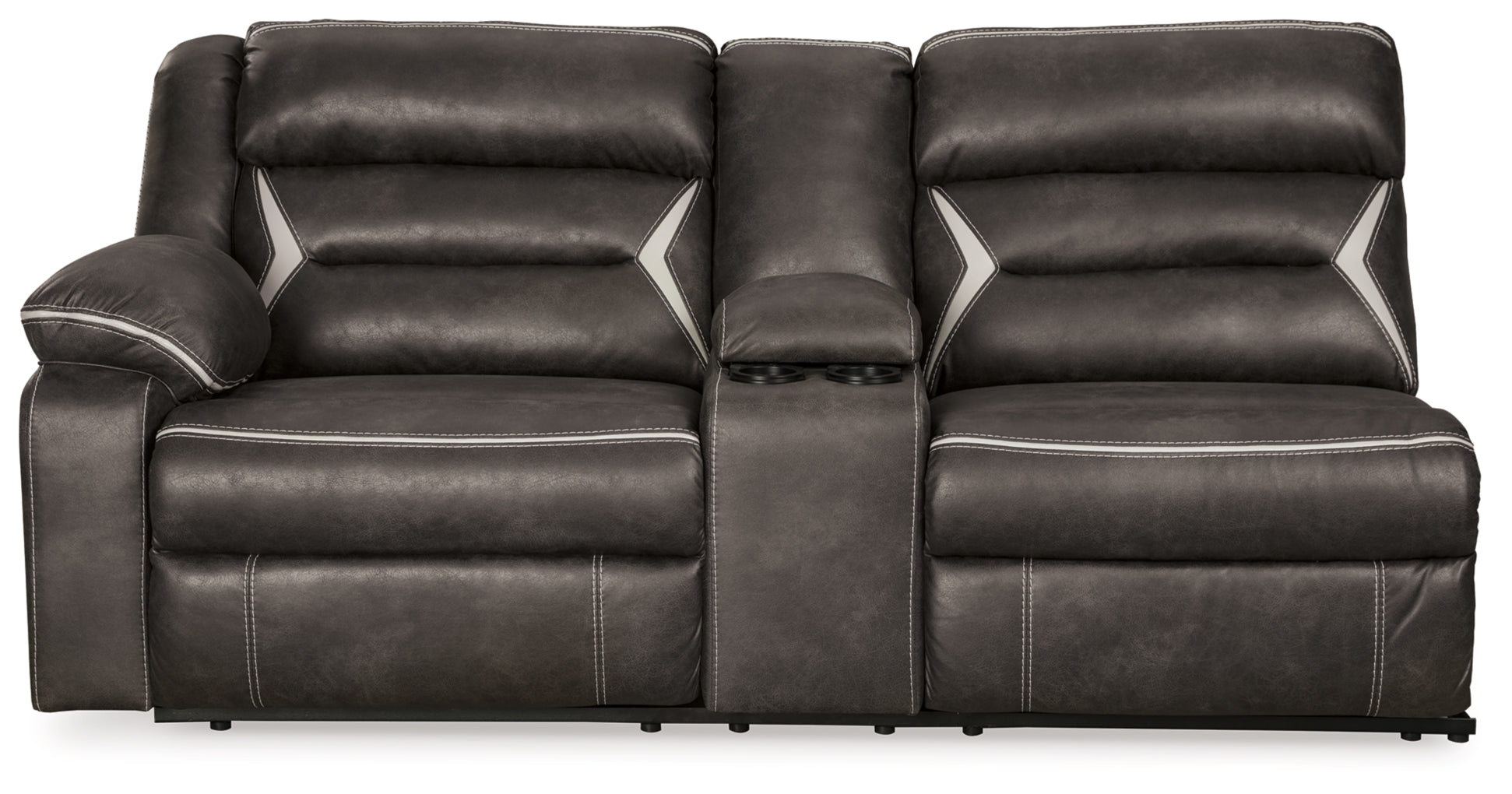 You could play it safe. Or you could choose to stand out in the crowd with this brilliantly styled sectional with power. Ultra cool, ultra contemporary and ultra comfortable, this fashion-forward sectional sports a fabulous faux leather enhanced with contrasting stitching thatÕs right on point. Rest assured, sumptuous pillow top armrests and sleek channel cushioning feel every bit as good as they look. Enlightened elements include a power control with USB plug-in and blue LED lighting (by the cup holders) to create a home theater experience worthy of A-listers.