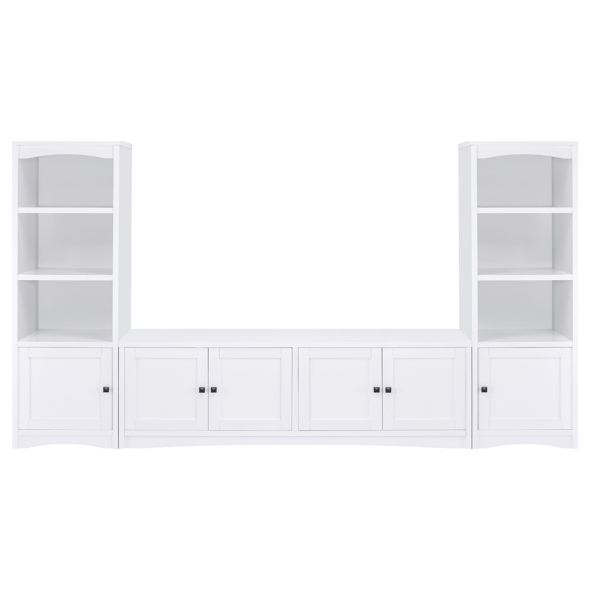 Transforme su sala de estar con este centro de entretenimiento de hermosa factura, diseñado para combinar estilo y funcionalidad para sus necesidades multimedia. Con un soporte para TV de 78 pulgadas, este conjunto es perfecto para albergar un televisor de hasta 85 pulgadas, ofreciendo una solución espaciosa y organizada para su hogar. El soporte para TV cuenta con cuatro puertas que se abren a estantes ajustables, con aberturas para la gestión de cables, lo que facilita mantener sus dispositivos multimedia y de juegos ordenados. Flanqueado por dos torres multimedia a juego, el centro de entretenimiento ofrece opciones adicionales de almacenamiento y exhibición con una combinación de estantes abiertos y gabinetes ocultos. Con un acabado cálido y neutro, este centro de entretenimiento combina a la perfección con cualquier decoración, creando un atractivo punto focal en su sala de estar.