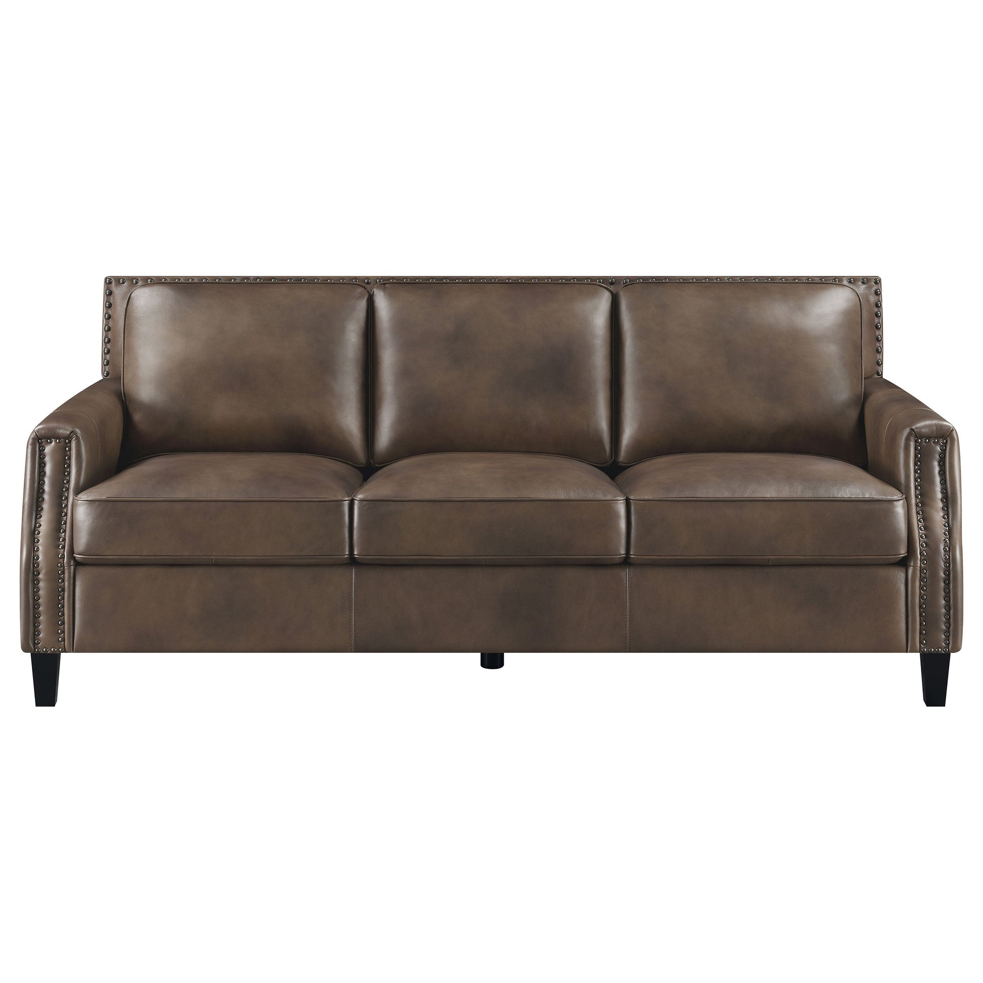 Elige un sofá que aporte comodidad y estilo a tu sala de estar. Tapizado en una atractiva tela color azúcar moreno, este mueble está fabricado con una lujosa tela de cuero. Los brazos empotrados le aportan un toque moderno, ideal para relajarse. Los detalles de tachuelas adornan los respaldos y los reposabrazos. Los mullidos cojines ofrecen un asiento suave para que tus amigos y familiares disfruten en cualquier ocasión.