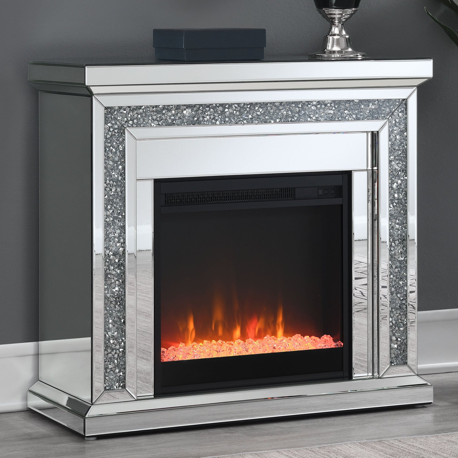 Los cristales triturados y brillantes aportan un toque lujoso a esta glamurosa chimenea. Cubierta con azulejos de espejo, molduras y bordes biselados, esta chimenea eléctrica independiente ofrece una luz relajante. Para un toque de calidez, encienda el elemento calefactor para un efecto más realista. La repisa de la chimenea le invita a exhibir la decoración o incluso a colocar velas adicionales para un ambiente aún más romántico. Este elegante complemento para chimenea se puede colocar prácticamente en cualquier lugar de la habitación, calentando espacios de hasta 37 metros cuadrados.
