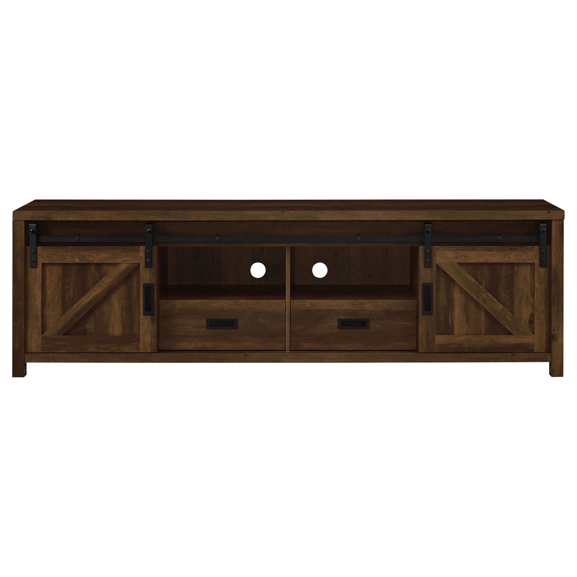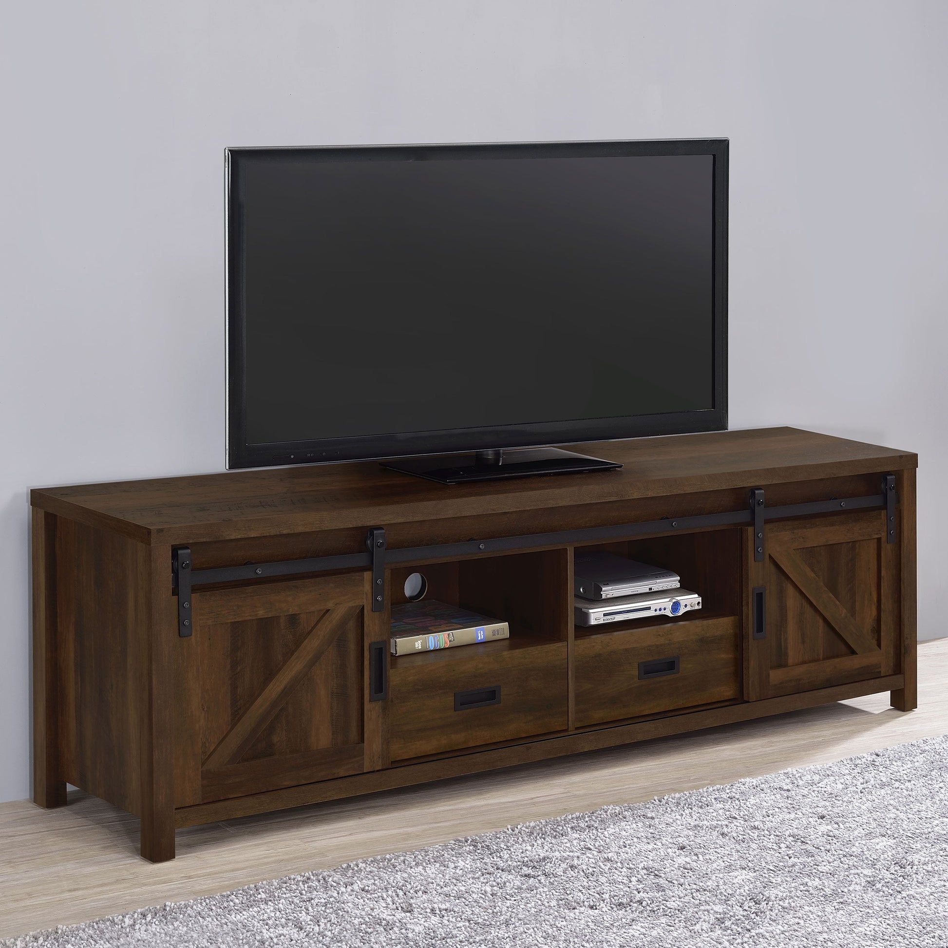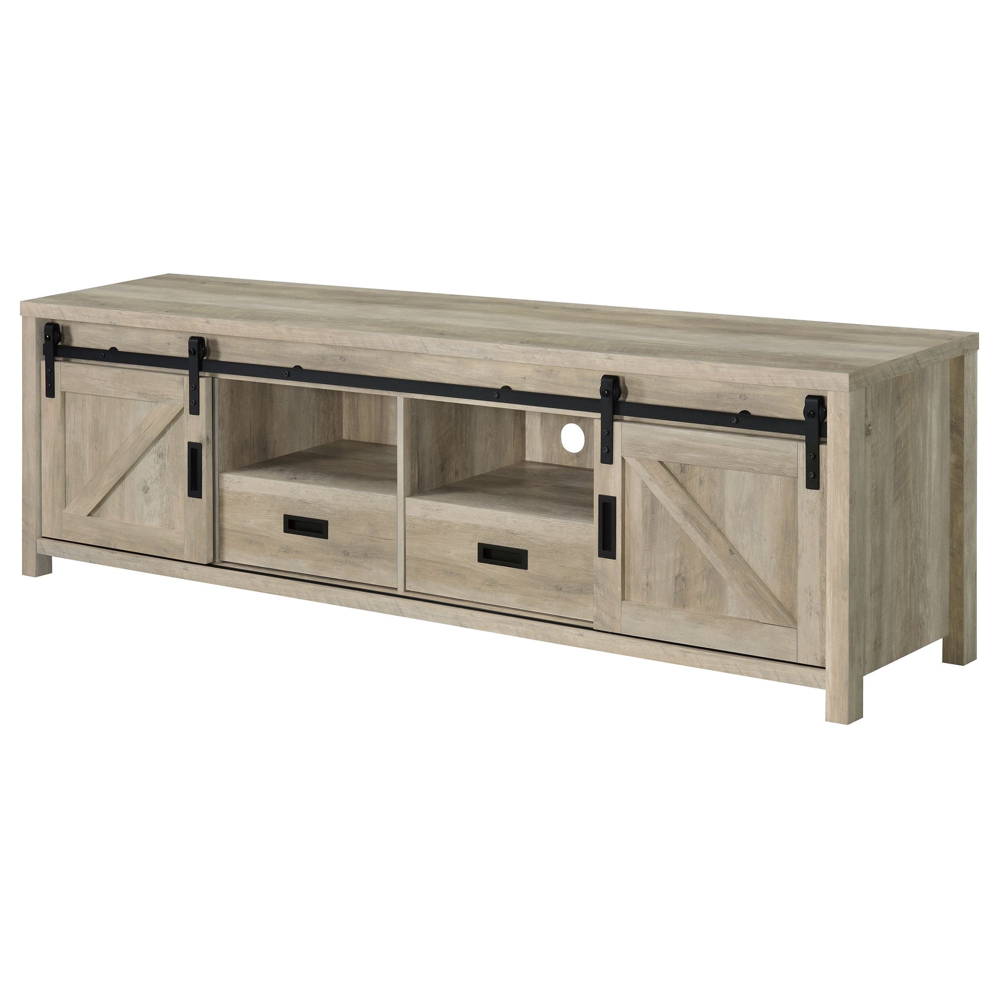 Acabados imitación madera y elementos de inspiración campestre crean esta consola de TV de estilo rústico. Guarda consolas de entretenimiento, un equipo de música y más, perfectamente organizados en dos estantes abiertos hacia el centro. Disimulada por puertas corredizas estilo granero con herrajes negros que le dan un toque industrial, esta consola de TV también guarda colecciones completas de películas, juegos y música. Con su diseño rectangular alargado y bordes rectos, esta consola es un complemento excelente para salas de entretenimiento y salas de estar. Esta consola de TV es una pieza encantadora y versátil para todo tu sistema de entretenimiento.