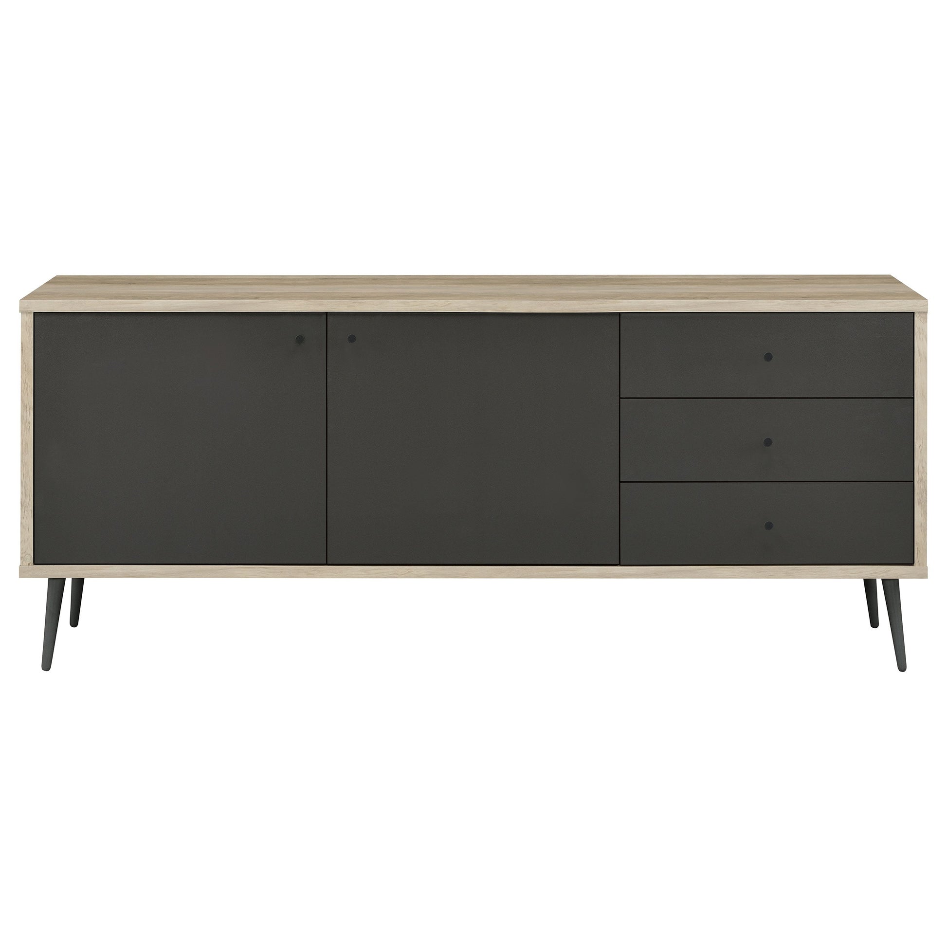 La luz, la energía y el diseño minimalista escandinavo se combinan para crear una solución de almacenamiento elegante para cualquier habitación. Un moderno armario con detalles en madera de pino, fresco y neutro, es perfecto para la sala o el comedor. Los frentes de las puertas y los cajones añaden un acabado gris antiguo en contraste, rico y elegante, que ofrece un color y estilo contrastantes para una apariencia destacada. Dos puertas se abren para revelar dos estantes, ideales para todo, desde vajilla hasta ropa y accesorios. Tres cajones crean el espacio perfecto para artículos pequeños, aportando organización a una entrada o una oficina en casa.
