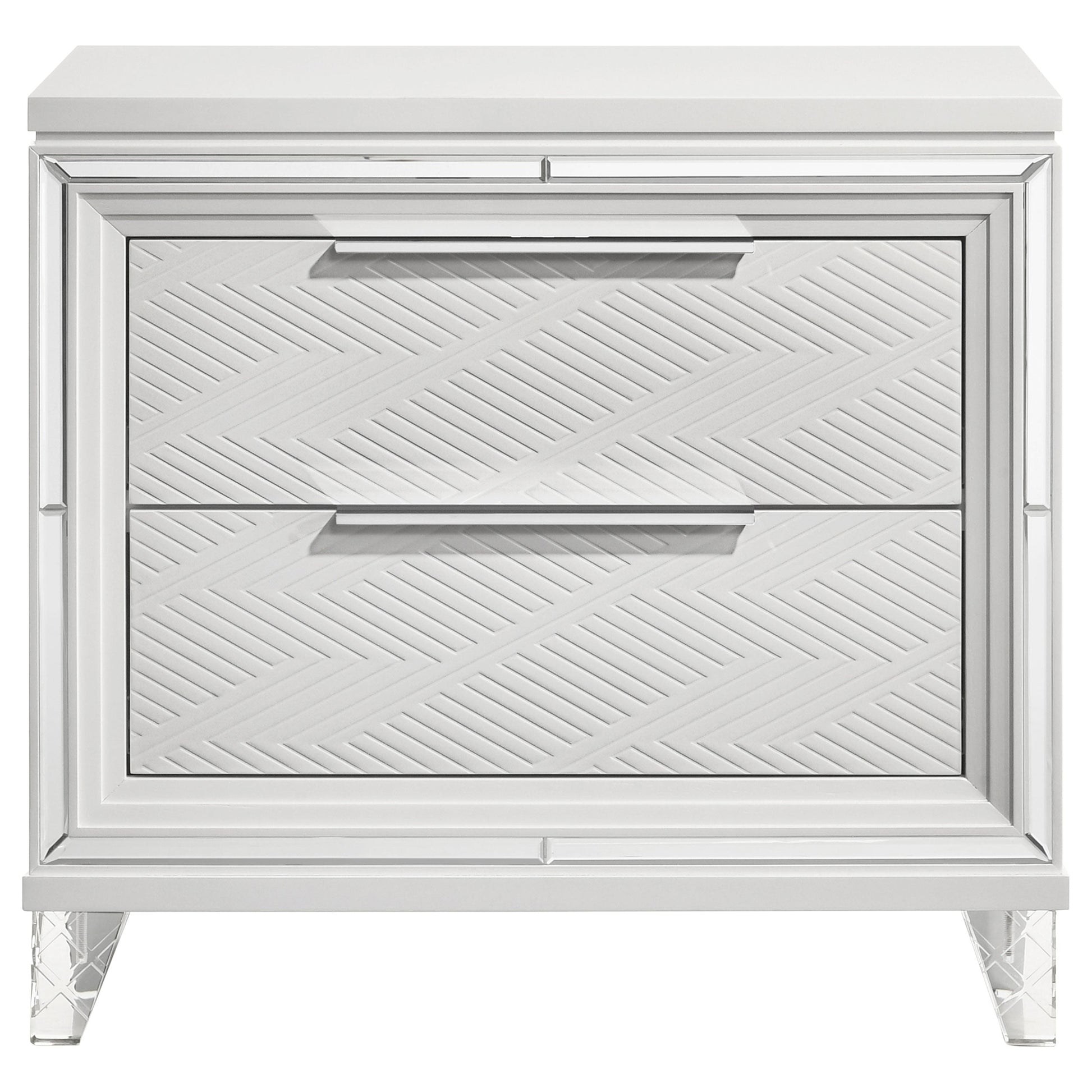 Completa el conjunto de tu dormitorio con esta elegante mesita de noche de dos cajones, diseñada con una moderna estética italiana. Su acabado blanco, realzado por un marco de espejo y herrajes de cromo pulido, crea una imagen impactante. Con paneles empotrados con marcos de fotos y un diseño gráfico de espiga en relieve, esta mesita de noche ofrece estilo y funcionalidad. El cajón superior incluye un sistema de gestión de cables, perfecto para tus dispositivos recargables. Fabricada con madera dura asiática, MDF y espejo, esta mesita de noche es un complemento de lujo para cualquier dormitorio.