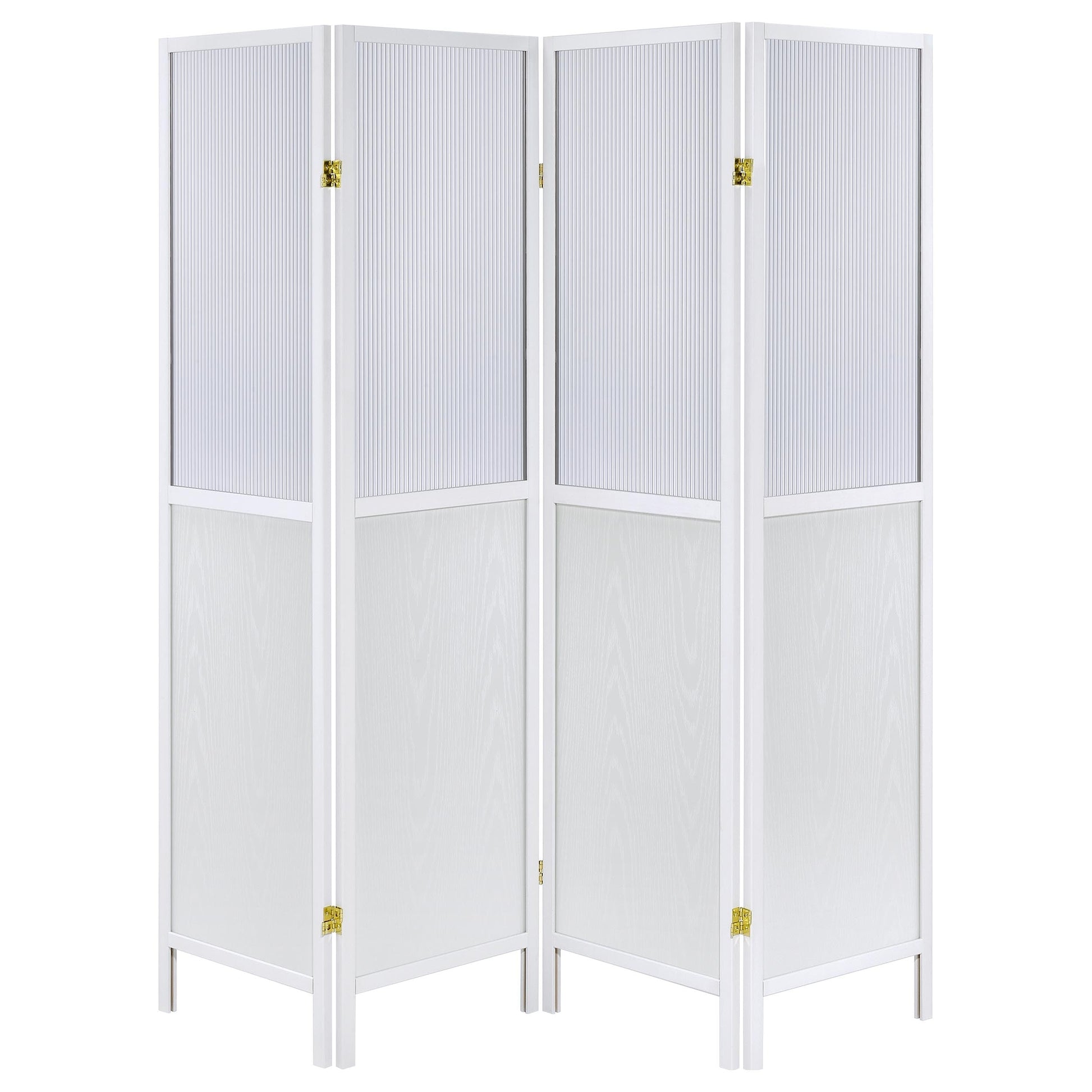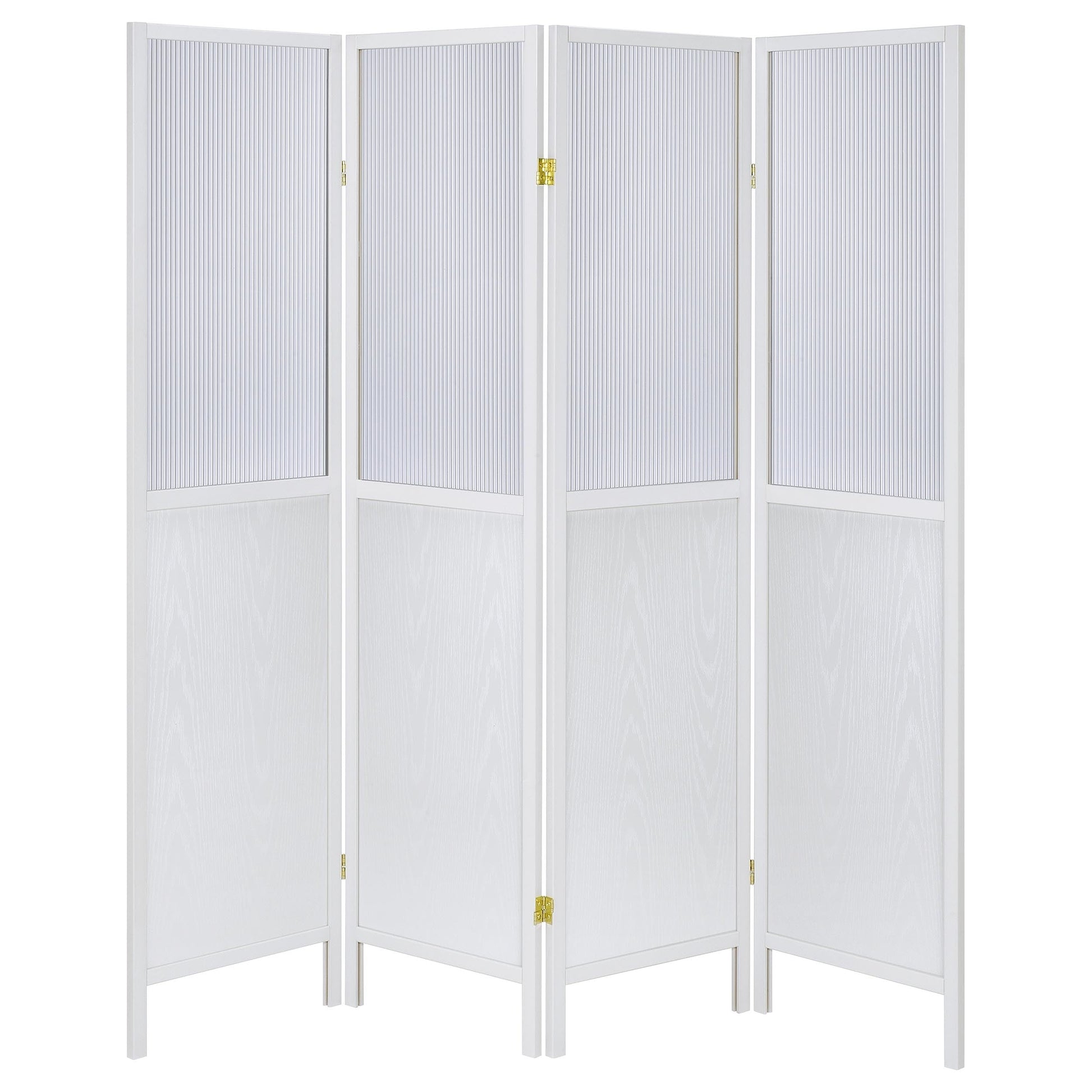 Cree la perfecta sensación de división en su espacio abierto con un biombo transicional de cuatro paneles. Esta pieza independiente cuenta con cuatro paneles altos, cada uno dividido por una sección superior semiopaca que permite el paso de la luz. Los paneles son ideales para un dormitorio principal grande, creando una sensación de privacidad para el vestidor o para separar un escritorio. El marco de cada panel presenta un acabado neutro y un panel inferior sólido para un excelente rendimiento y privacidad. Los paneles inferiores tienen un sutil acabado de veta de madera que aporta un toque de dimensión a cualquier habitación.