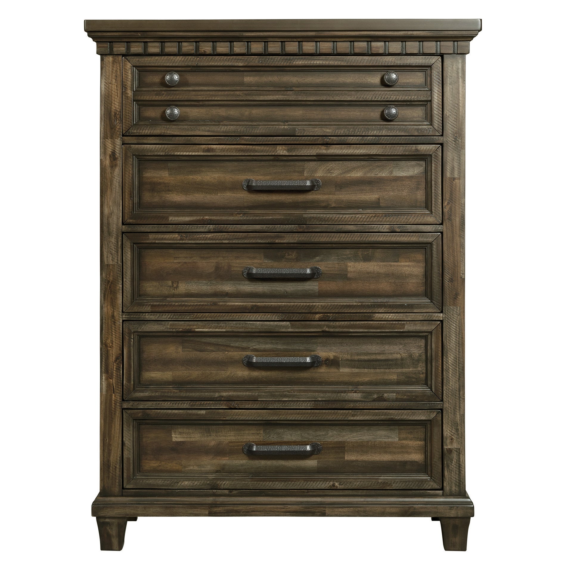The McCoy 5-Drawer Chest brings both style and functionality. It features spacious drawers that are ideal for finding a spot for all your different belongings. The top drawer features a hidden drawer and is also felt-lined, perfect for storing away more delicate items. Dental molding outlines the top front edge and gives this classic piece an added flair. Dark metal hardware complements the smokey walnut finish.