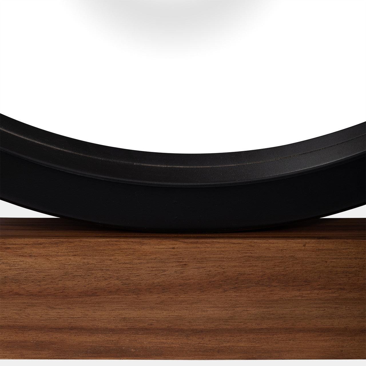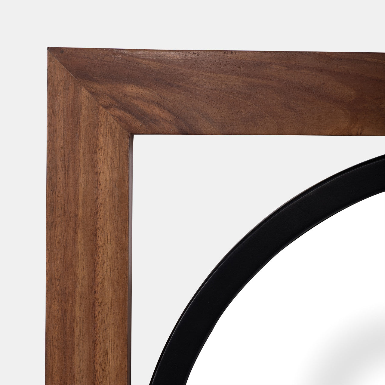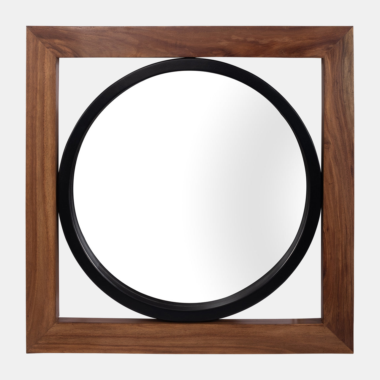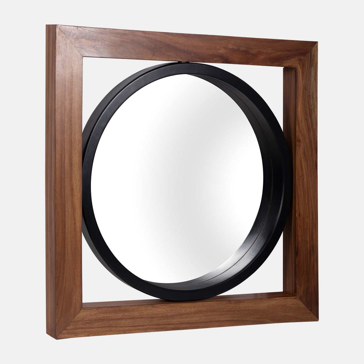 Este espejo presenta un impactante diseño moderno con un singular juego de formas geométricas. Un elegante marco circular negro se integra en un marco cuadrado de madera más grande, creando un marcado contraste que añade profundidad y dimensión. La rica veta natural de la madera del marco exterior realza su calidez y atractivo orgánico, mientras que el marco interior negro le aporta un toque contemporáneo.