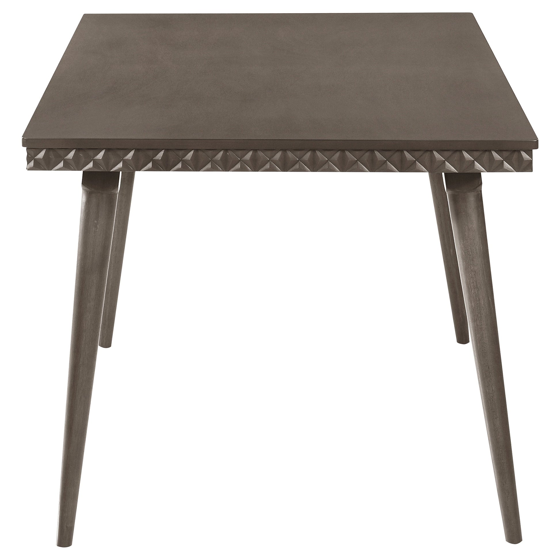 Incorpore la elegancia moderna a su comedor con esta impresionante mesa de comedor de 150 cm. Su diseño distintivo presenta detalles intrincados a lo largo del faldón, que contrastan con la textura de su tablero liso. Fabricada con una combinación de madera maciza, madera de ingeniería, MDF repujado y chapa de okume, esta mesa garantiza durabilidad y estilo. El acabado marrón oscuro realza su aspecto elegante y sofisticado, convirtiéndola en el punto focal de cualquier comedor. Sus patas cónicas le dan un toque de mediados de siglo a la vez que conservan un atractivo contemporáneo, perfecta para hogares modernos o de transición.