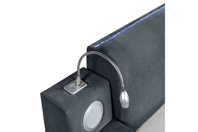 The Ottawa Transformer Bed by Elements is where cutting-edge functionality meets modern glam. Upholstered in plush gray fabric and designed with a sleek, contemporary aesthetic, this bed transforms your bedroom into a luxurious retreat tailored for comfort, convenience, and style. More than just a place to sleep, the Ottawa is an all-in-one lifestyle solution. It features a built-in chaise lounge for relaxing in style, integrated reading lights for a soft evening glow, and built-in Bluetooth speakers to immerse you in your favorite music or podcasts. A subtle light strip adds a touch of ambiance, perfect for winding down at the end of the day. Stay effortlessly connected with strategically placed power outlets, USB ports, and a convenient drop-down table—perfect for working from bed or enjoying breakfast in style. Built-in cupholders and hidden storage compartments offer thoughtful solutions for keeping everything you need within arm’s reach and out of sight. Whether you’re lounging, charging, reading, or streaming, the Ottawa Transformer Bed elevates every moment you spend in your bedroom.