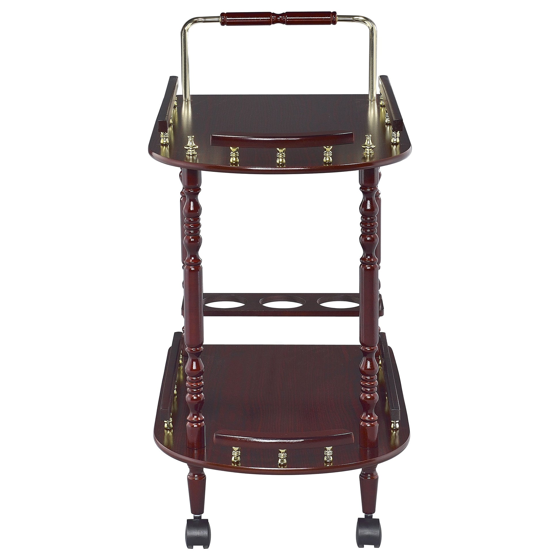 Este elegante carrito de servicio quedará perfecto tanto en su comedor formal como en su sala de estar. Cuenta con un asa para empujar y un amplio estante superior para una tabla de quesos y dos copas de coñac. El estante inferior incluye un portabotellas para tres botellas de su Burdeos o whisky de malta favorito. Elegantemente elaborado con acabado merlot y detalles metálicos con un acabado llamativo, le da a su habitación un aire campestre tradicional.