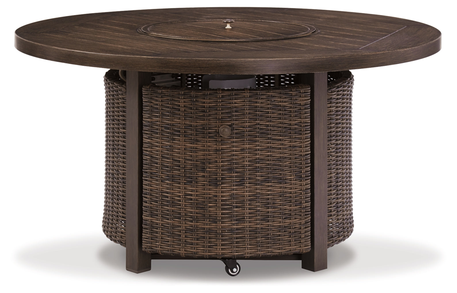 Turn your backyard space into your own piece of paradise with the Paradise Trail outdoor table with fire pit. Though this outdoor table looks remarkably like wood, itÕs made of sturdy, rust-proof aluminum thatÕs perfectly suited for alfresco living. Enhancing the rustically refined aesthetic: side panels accented with all-weather, handwoven resin wicker. The result may look high maintenance, but rest assured, this outdoor fire pit table is anything but. With the press of a button, ignite a flickering flame that dances over a bed of glass beads. And with room for up to eight, itÕs one highly accommodating outdoor bar table.