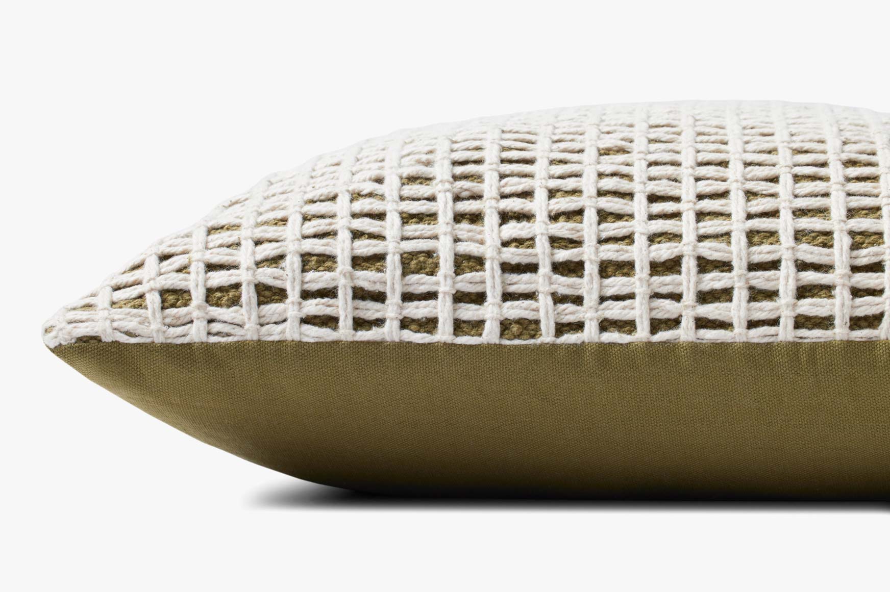 A subtly textured ivory grid covers this modern green throw pillow. The pillow is made of cotton and polyester and measures 18” x 18”, a standard size to style in living rooms and bedrooms.