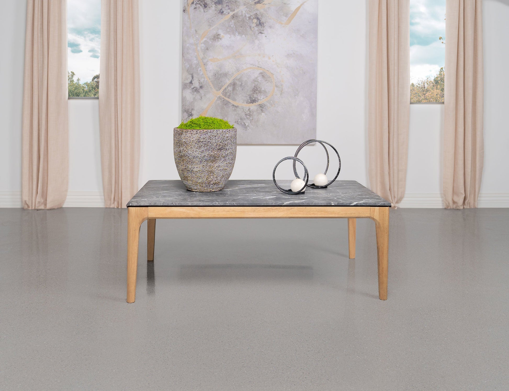 La mesa de centro se extiende con la seguridad que le otorga su herencia moderna de mediados de siglo, luciendo un tablero rectangular que ofrece la lujosa apariencia del mármol sin su peso. Su superficie laminada a alta presión, con un laminado decorativo de imitación mármol, es un deleite visual, contrastando con la base marrón natural que la ancla con un toque terroso y auténtico. Las líneas elegantes y los tonos grises fríos son un guiño a una era del diseño que celebraba la estética limpia y la belleza funcional. Es más que una superficie; es una pieza destacada, diseñada para reunirse, exhibir, disfrutar y apreciar.