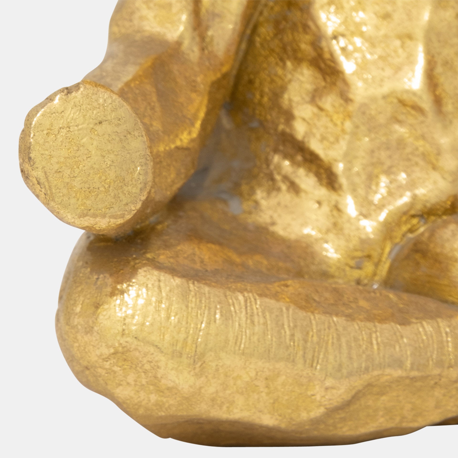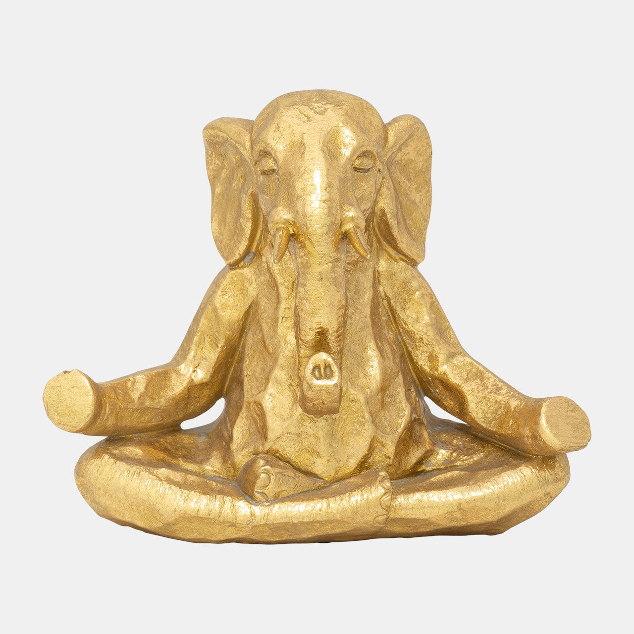 - Esta escultura de poliresina de alta calidad presenta un elefante sentado con las piernas cruzadas en una postura de meditación pacífica. Presenta un glamuroso color dorado metálico brillante.