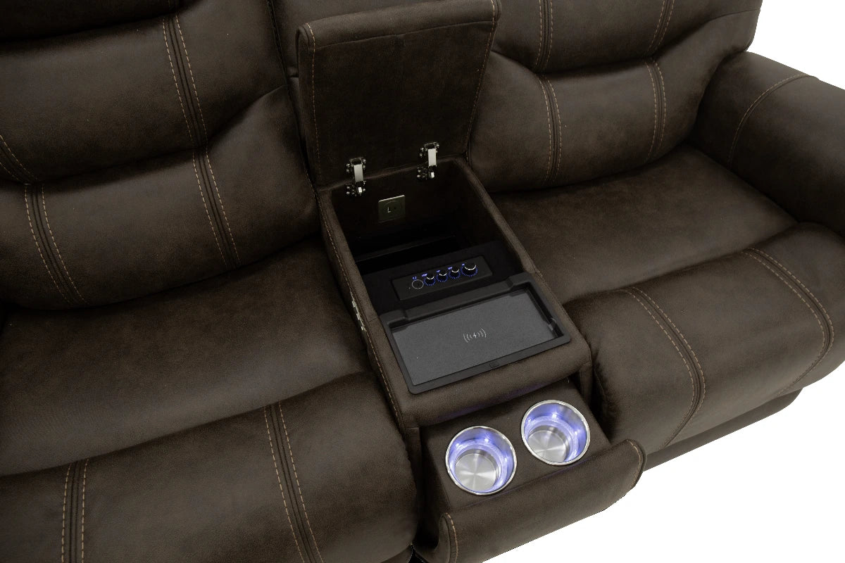 Relax in style with this 2-piece power living room set, featuring a plush sofa and loveseat designed for ultimate comfort. Upholstered in a rich walnut brown finish, each piece includes power reclining seats for effortless lounging. The loveseat is enhanced with a convenient center console, perfect for storing remotes and holding drinks. With generously padded cushions, rolled arms, and detailed stitching, this set blends comfort with a classic look that elevates any living space.