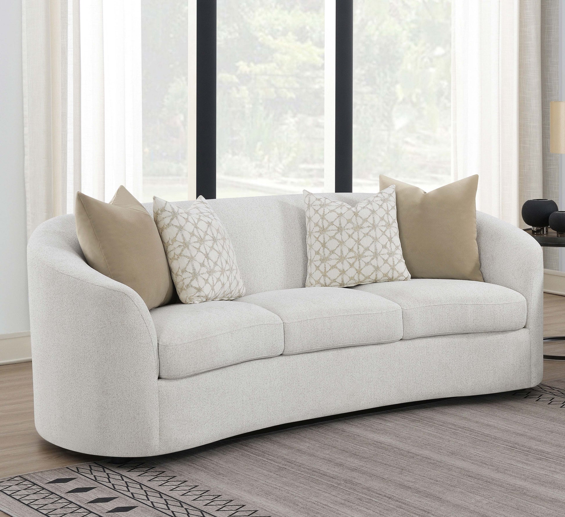 Crea una acogedora sala de estar con este sofá contemporáneo curvo, tapizado en bouclé color latte de suave textura en su elegante silueta contorneada y reposabrazos inclinados. Los cojines a juego con relleno de plumón sintético de primera calidad ofrecen una comodidad extra a este sofá ligero y luminoso, que descansa sobre tres mullidos cojines.