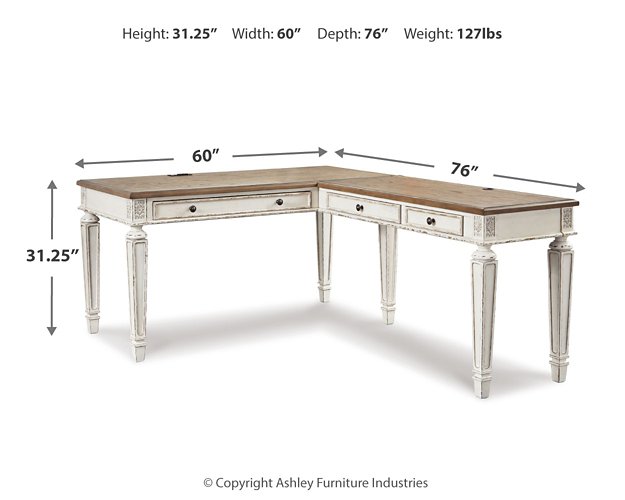 Elevando el arte del estilo rústico tradicional, este escritorio en forma de L es la realización de tu oficina en casa ideal. Su acabado bicolor combina blanco desportillado con tableros de madera envejecida para un mayor encanto. Los frentes de cajón enmarcados, las ménsulas decorativas y las elegantes patas torneadas y cónicas aportan refinamiento, mientras que los tiradores en bronce oscuro le dan un toque clásico.| Dimensión completa | 60 ancho x 76 profundidad x 31,25 alto |