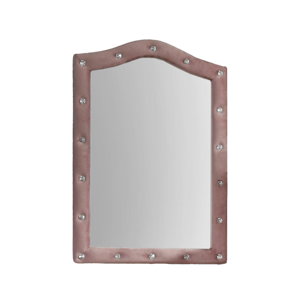 El espejo juvenil Reggie en tela rosa tiene mucho carácter. Esta glamurosa pieza luce detalles de botones con efecto cristal a lo largo de su ribete acolchado. Un sutil arco en la parte superior del marco le da un toque elegante y vintage. Deja que el encantador espejo Reggie adorne tu hogar.