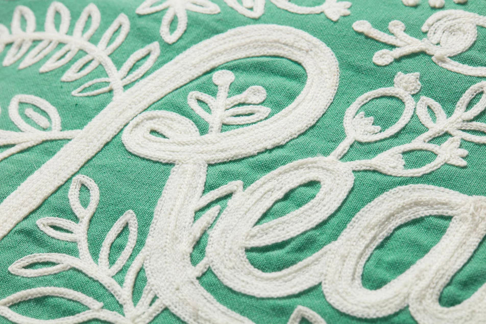 Elegante almohada de la India, tejida a máquina con 100 % algodón para una textura suave y duradera. Cuenta con un cierre de solapa oculto y una cremallera dorada pulida adornada con el logotipo de Rifle Paper Co., que le aporta un toque de sofisticación. El tratamiento de filo afilado garantiza un acabado limpio y moderno, mientras que el reverso verde complementa su versátil diseño. (33 x 53 cm)