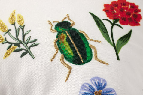 Este cojín decorativo de Rifle Paper Co. x Loloi presenta flores de jardín e insectos que brotan de cada esquina sobre un fondo blanco, con ribetes festoneados en tinta alrededor de los bordes. La parte delantera del cojín está hecha de 100 % poliéster y mide 56 x 56 cm, un tamaño estándar para decorar salas de estar y dormitorios.