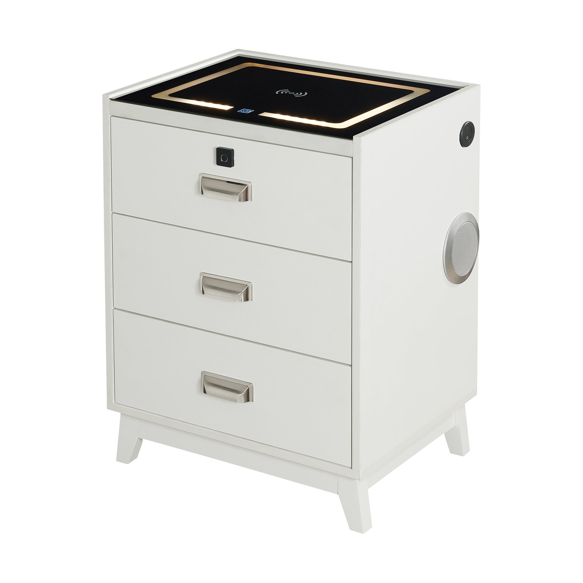 Elevate your nighttime routine with the Rio Nightstand, a blend of sleek modern design and advanced technology. Its smooth finish exudes contemporary elegance, while the integrated wireless charging keeps your devices powered effortlessly. Equipped with a fingerprint lock for secure storage, built-in Bluetooth speakers for immersive sound, and USB Type A & Type C ports for versatile connectivity, this nightstand is designed for convenience. Set the mood with soft lighting on top, and enjoy the luxury of a felt-lined top drawer for your essentials. The Rio Nightstand perfectly balances style, innovation, and functionality for a seamless bedroom experience.