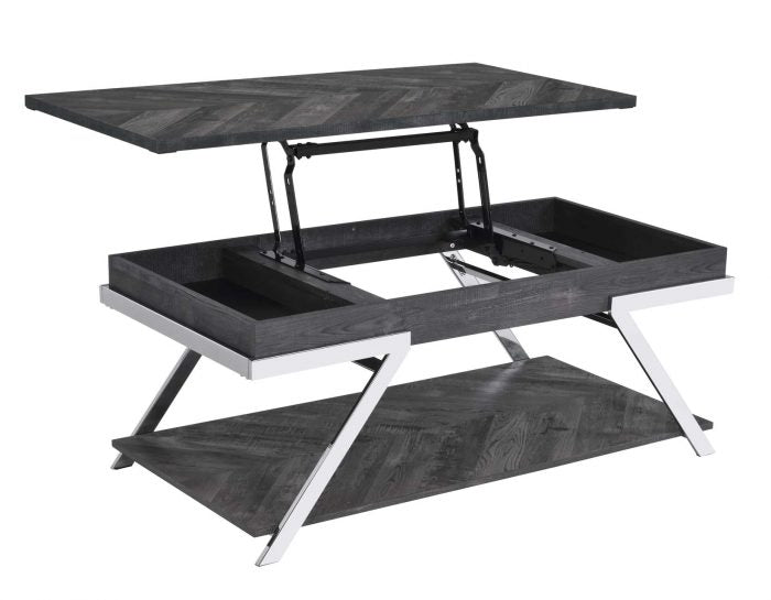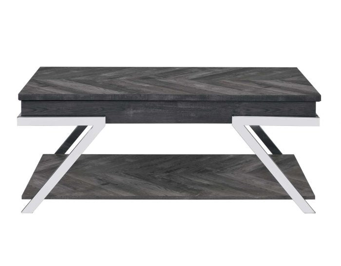 - Los detalles de estilo incluyen una apariencia rústica combinada con patas cromadas inclinadas y un patrón de chapa de chevron simulado.