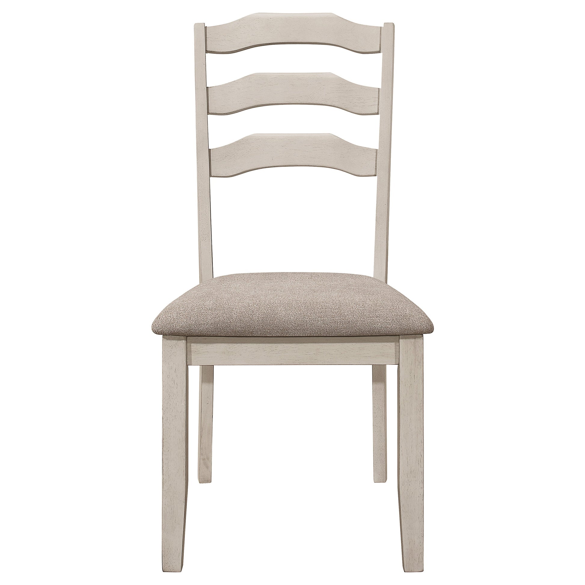 Cree un ambiente acogedor con este moderno juego de comedor de estilo rústico y costero. El diseño en forma de estrella del tablero de chapa de mindi, con patas de madera maciza asiática, y el acabado rústico en crema en el faldón y las patas, añaden un toque campestre a su comedor. La silla con respaldo en escalera, con acabado en crema envejecido en las patas y el respaldo, cuenta con un asiento tapizado en tela de poliéster color caqui para mayor comodidad.