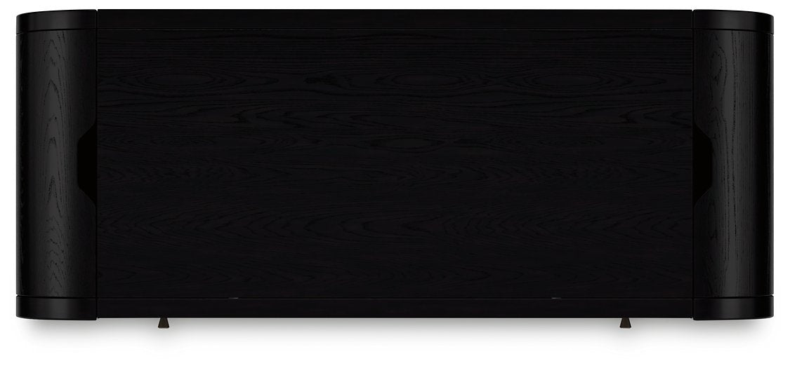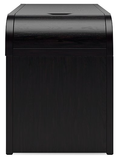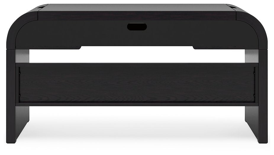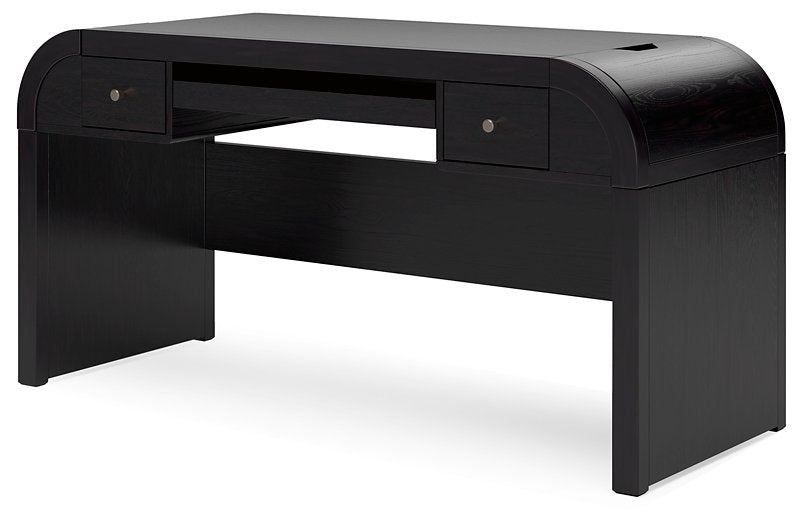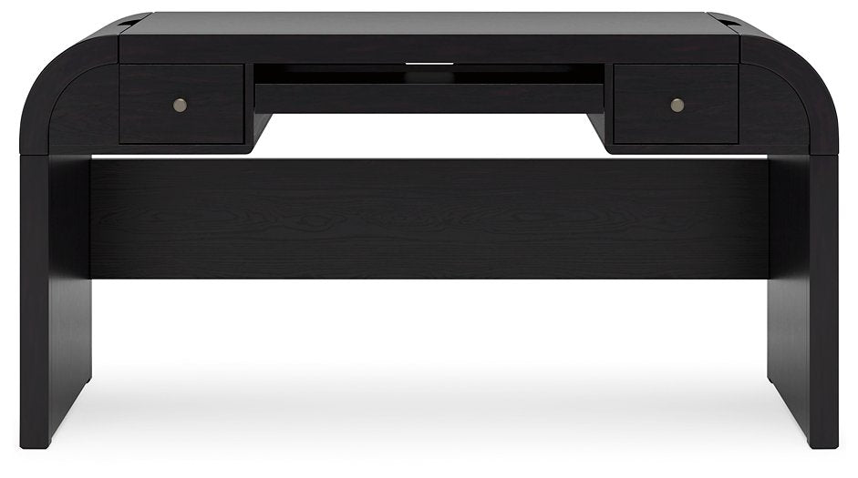 Inspirado en el diseño art déco, este escritorio de oficina en casa de formas suaves deja una impresión duradera de forma sencilla y espectacular. Su magnífica silueta curva se ve realzada por un rico acabado negro en capas sobre la superficie texturizada con vetas de madera. Completo con amplio espacio de almacenamiento, bandeja extraíble para teclado y carga USB, este es el mueble todo en uno que buscabas para realzar la decoración de tu espacio de trabajo contemporáneo.| Dimensión completa | 60 ancho x 24 profundidad x 30 alto |