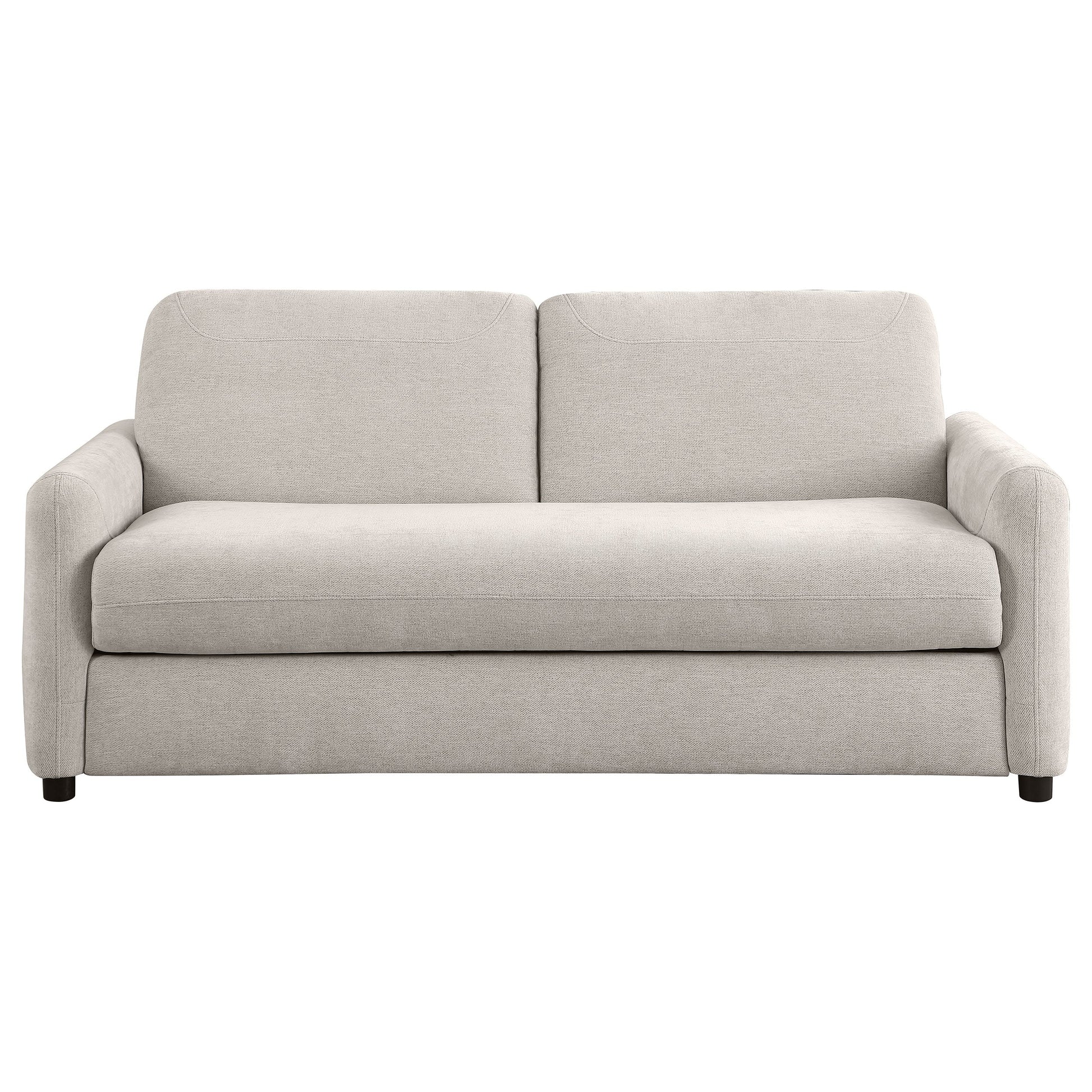 Dale un toque versátil a tu sala de estar con un moderno sofá cama que ofrece un estilo elegante y una comodidad óptima. Esta funcional solución de asiento cuenta con finos brazos redondeados y cojines tipo banco que complementarán tu decoración. El sofá, con su suave tapizado beige y su perfil de líneas limpias, esconde un práctico espacio para dormir para invitados, transformándose en cama fácilmente con un solo paso mediante un tirador ubicado en la parte superior del respaldo. Ofreciendo comodidad y soporte, el sofá se convierte en una superficie de descanso tamaño queen que incluye un cojín de espuma viscoelástica sobre un acolchado de espuma para una sensación de lujo. Las costuras le dan un toque personalizado a este encantador sofá cama, convirtiéndolo en la opción perfecta para una oficina en casa multifuncional o una sala de estar compacta.