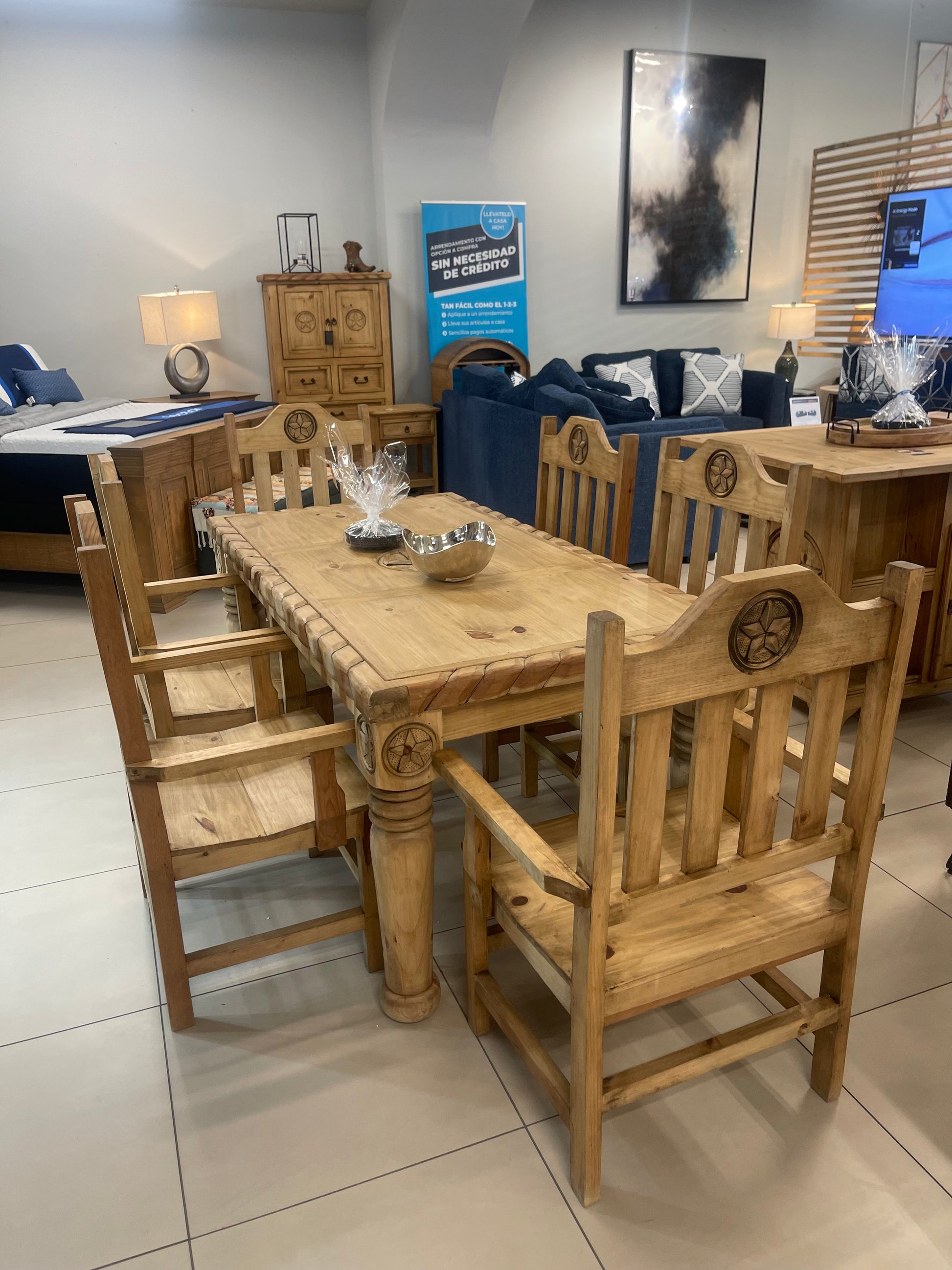 La artesanía rústica se fusiona con un diseño sofisticado en la mesa alta San Antonio. Hecha a mano en México con madera maciza, esta mesa cuenta con un centro de estrella tallado con detalles de estrellas a juego en cada esquina de las patas. El acabado natural teñido a mano realza la riqueza de la madera, mientras que la altura del mostrador aporta un toque informal, inspirado en un bar, a cualquier comedor.