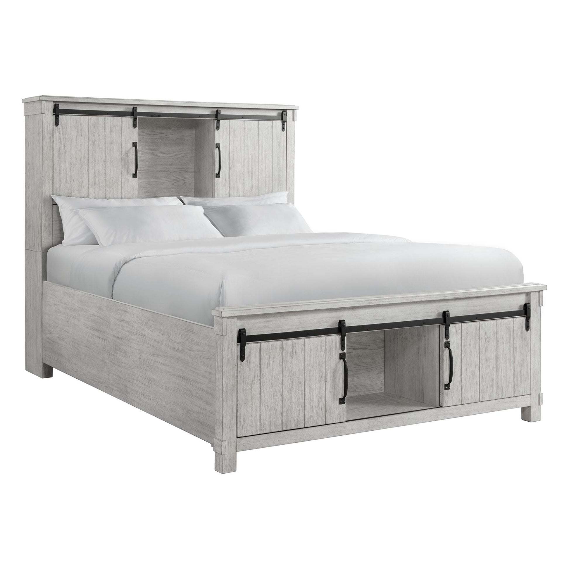 The Scott Queen Platform Storage 6PC Bedroom Set is going to look amazing in your home! This set includes a bed, dresser, mirror, chest and two nightstands. The headboard and footboard feature an open display case, perfect for storing your favorite decor. Easily slide the cabinet doors on select pieces in the collection to access your belongings. The nightstand features two USB ports, that will keep your devices fully charged while you sleep. Inside the nightstand, you can also find a hidden drawer that allows you to store away your more valuable items. Dark, metal hardware pairs beautifully with the white washed finish making this a transitional farmhouse a staple in your home year after year!