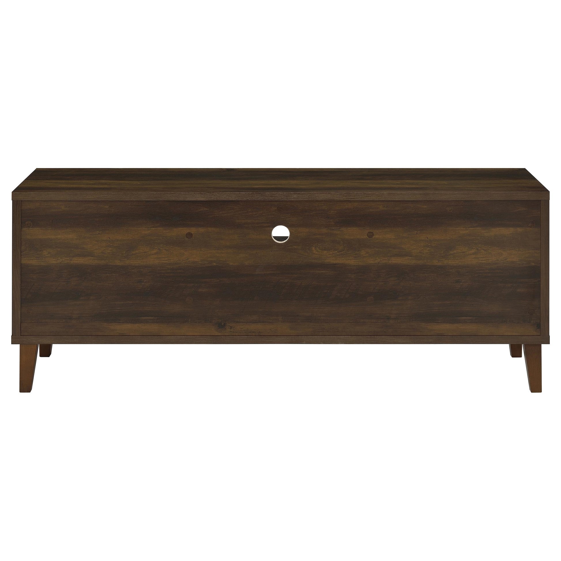 Dale un toque de estilo moderno de mediados de siglo a tu sala con un mueble para TV fabricado con madera de ingeniería y madera de caucho. Esta consola multimedia, diseñada para televisores de hasta 65 pulgadas, ofrece un acabado de madera de pino oscuro sobre melamina, combinando una excelente durabilidad con un estilo elegante. Los modernos frentes de las puertas con listones, adornados con tiradores de plástico negro, se abren para revelar amplias opciones de almacenamiento. En el interior, encontrarás una estantería central abierta con un orificio para el cable y estantes adicionales ideales para guardar dispositivos multimedia, juegos o accesorios. Con patas de madera maciza, este mueble para TV no solo mantiene tu espacio ordenado y organizado, sino que también proporciona una base sólida.